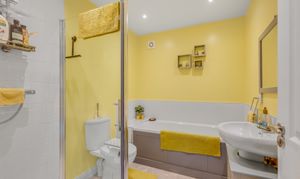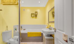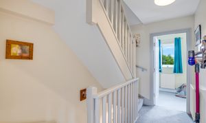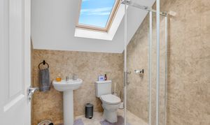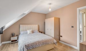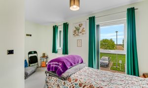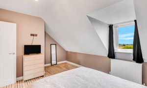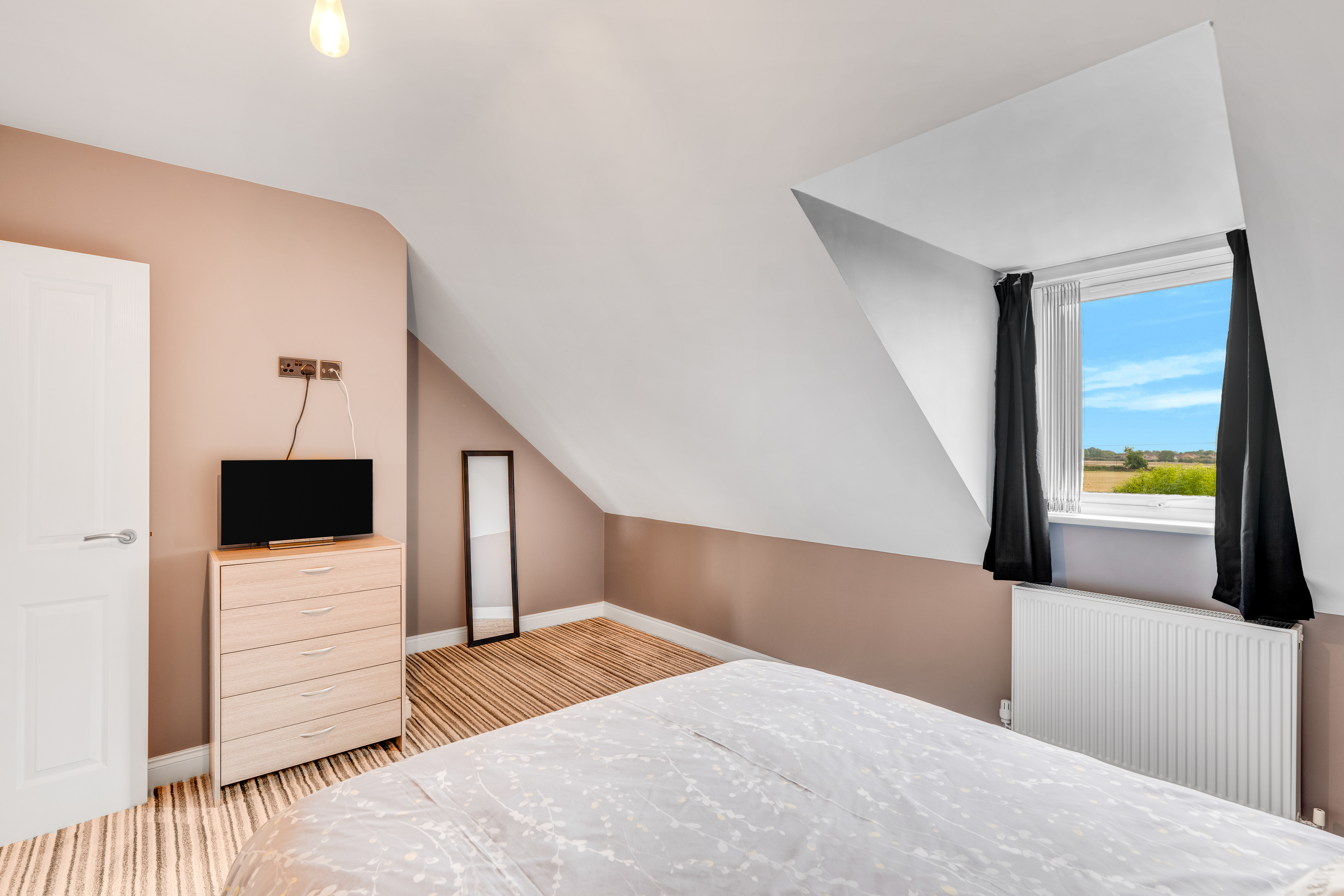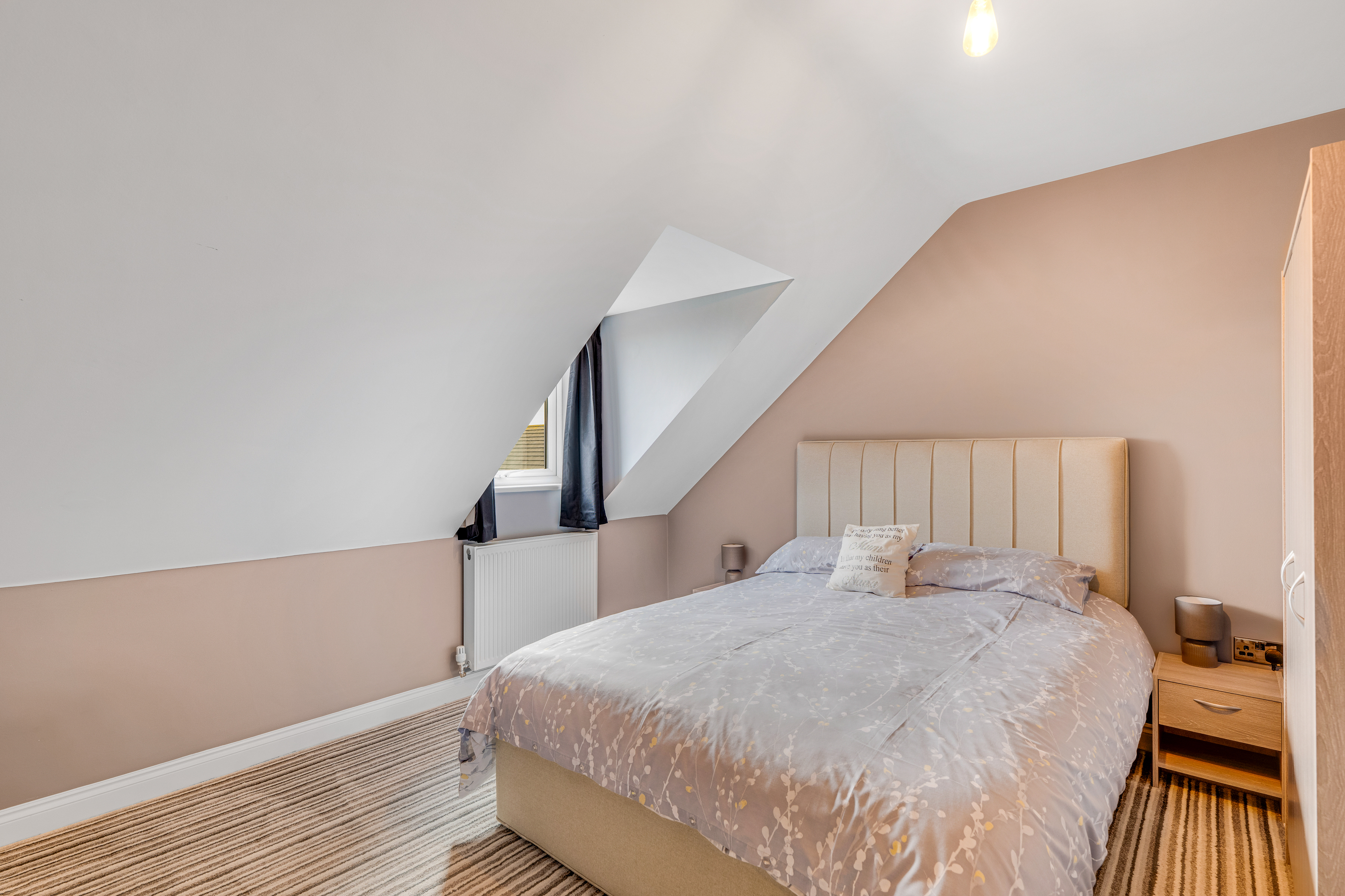 Ascending to the first floor, the generous landing leads to the master bedroom—complete with fitted wardrobes and mirrored sliding doors—and a good-sized second bedroom. The four-piece suite family bathroom serves both rooms, offering a bath, separate shower, toilet, and basin.