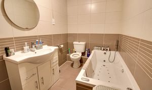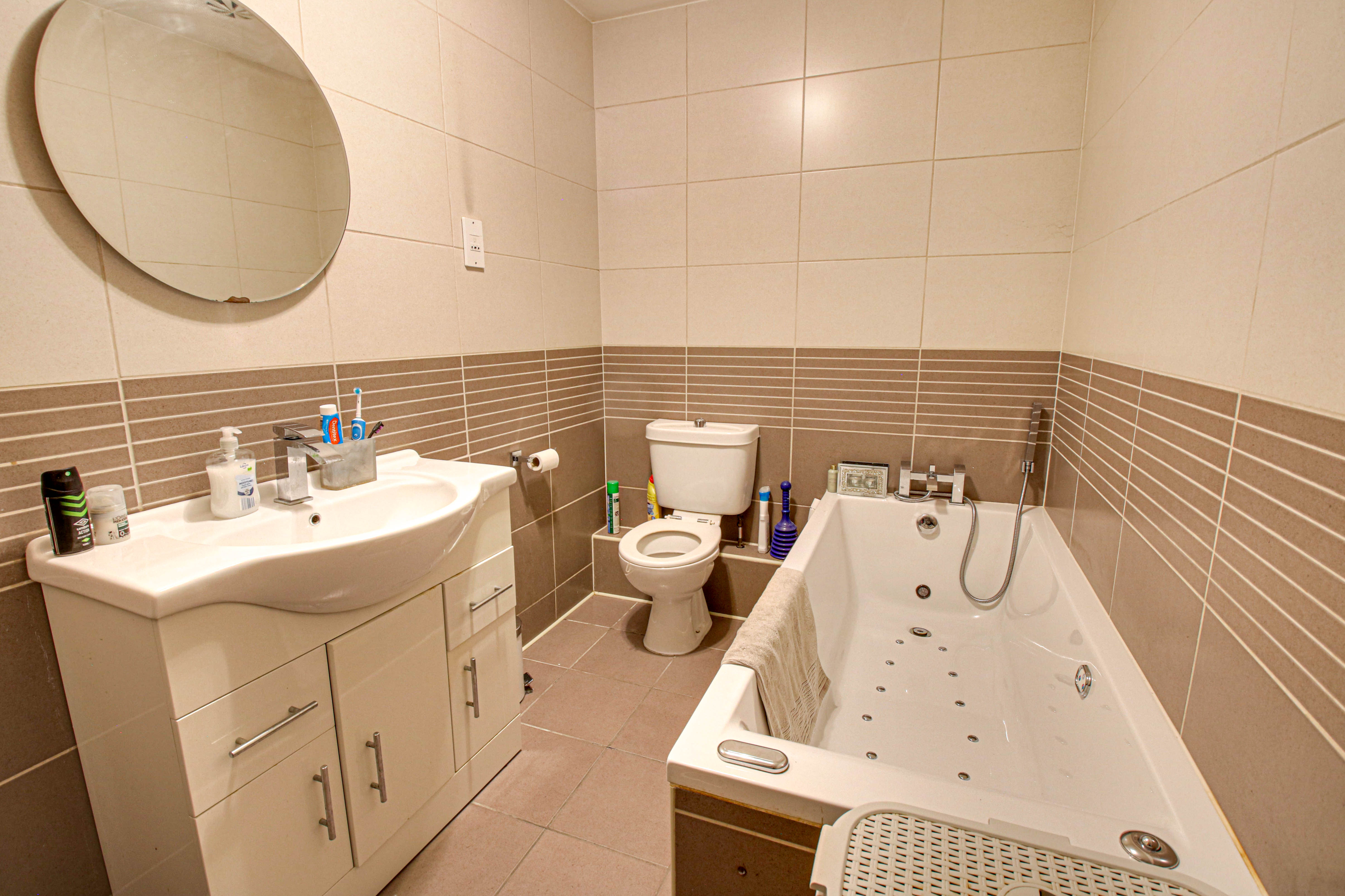Three piece suite comprising of low flush WC, Spa Bath, Vanity Sink Unit, tiled walls and floor and heated towel rail.