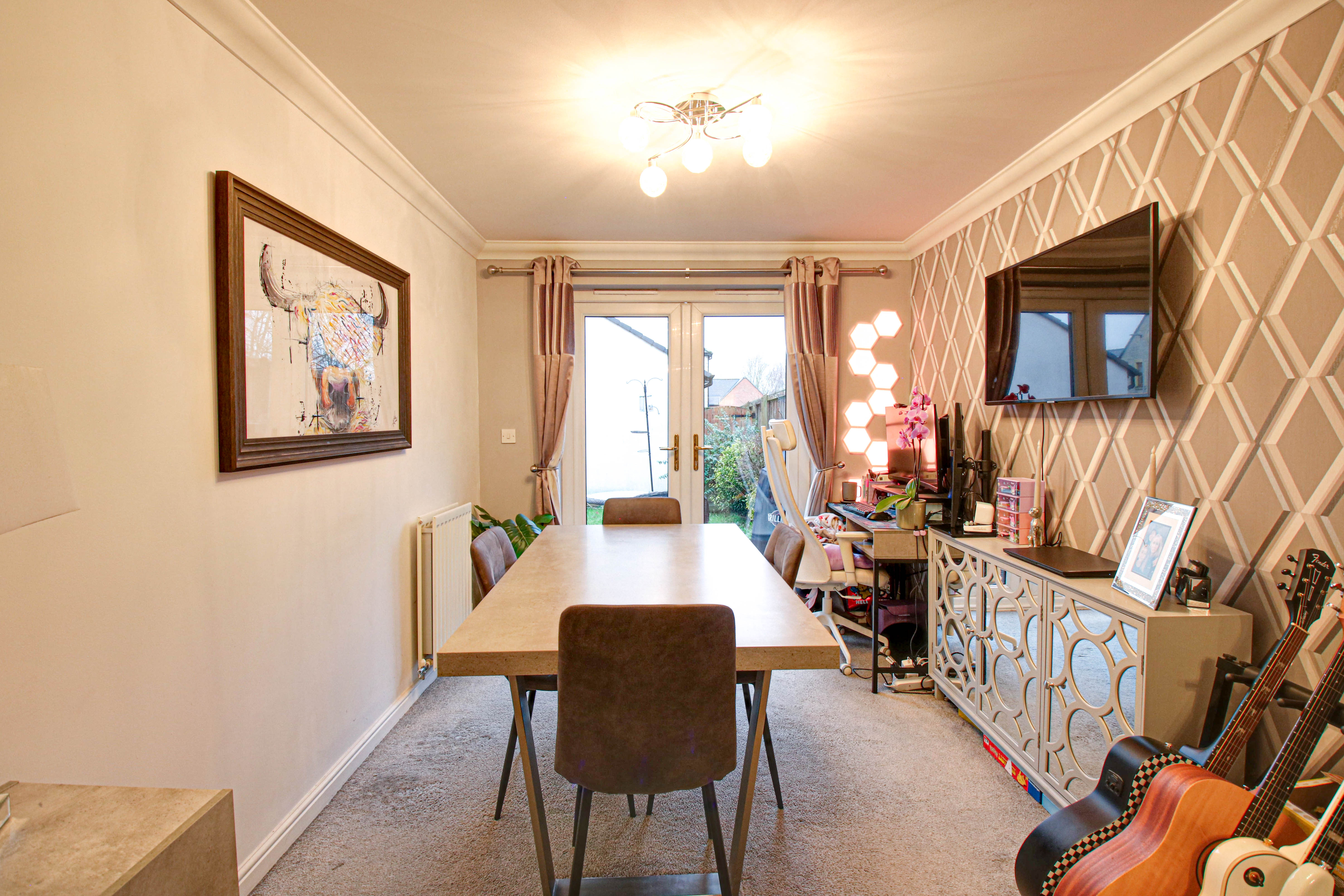 Outside, the south west facing garden is a real highlight, with a lovely lawn and a patio area that’s perfect for summer barbeques or simply unwinding as the sun sets. There’s a garage with a drive in front, giving you secure parking and extra storage for bikes or garden gear. The development also features a communal green area, providing extra space for children to play or for neighbours to gather. With its blend of private outdoor space and shared community facilities, this property offers the best of both worlds for families, couples, or anyone looking to enjoy a relaxed village lifestyle with plenty of open space. Whether you’re looking to grow your own vegetables, enjoy a morning coffee in the sunshine, or just appreciate the fresh air and open views, this home is ready to welcome you.