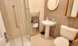 Three Piece suite comprising of cubicle shower, sink and low flush WC, tiled walls and floor and heated towel rail.
