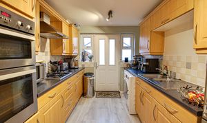 Rear facing upvc double glazed window, fitted range of base and wall units, inset oven, four ring gas hob, bowl and half sink drainer unit, plumbed for washer, plumbed for dishwasher and under stairs cupboard.