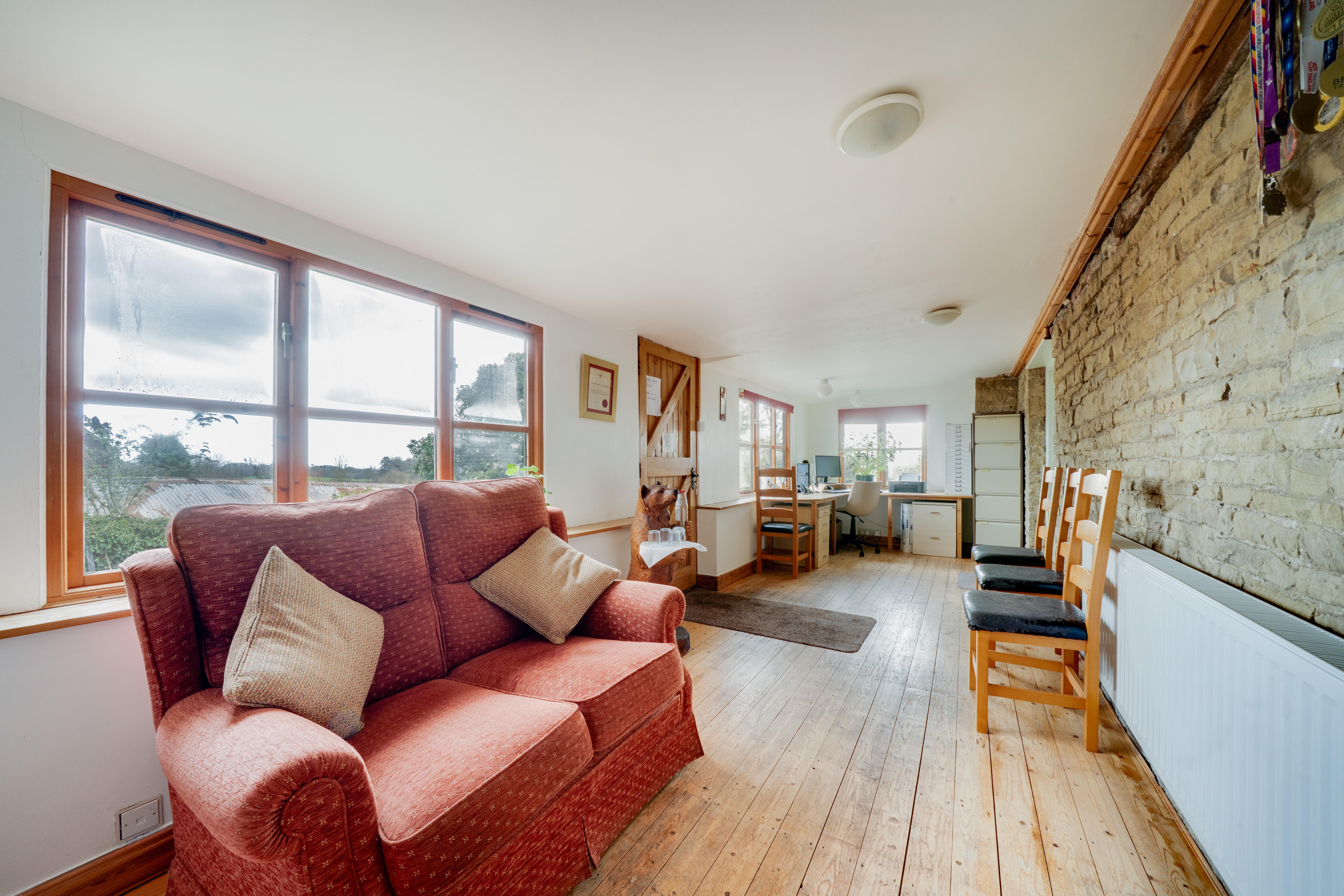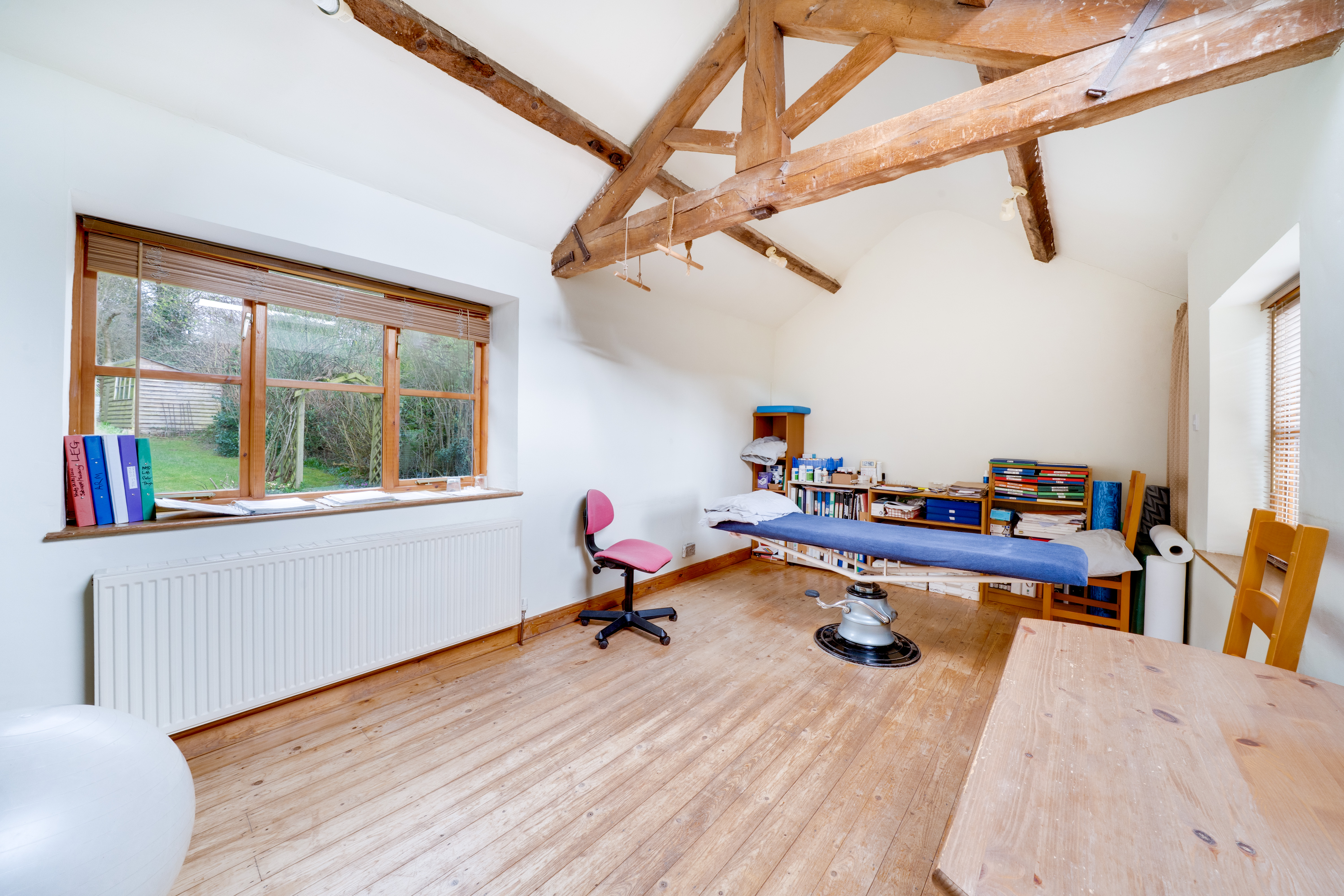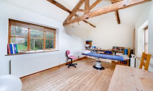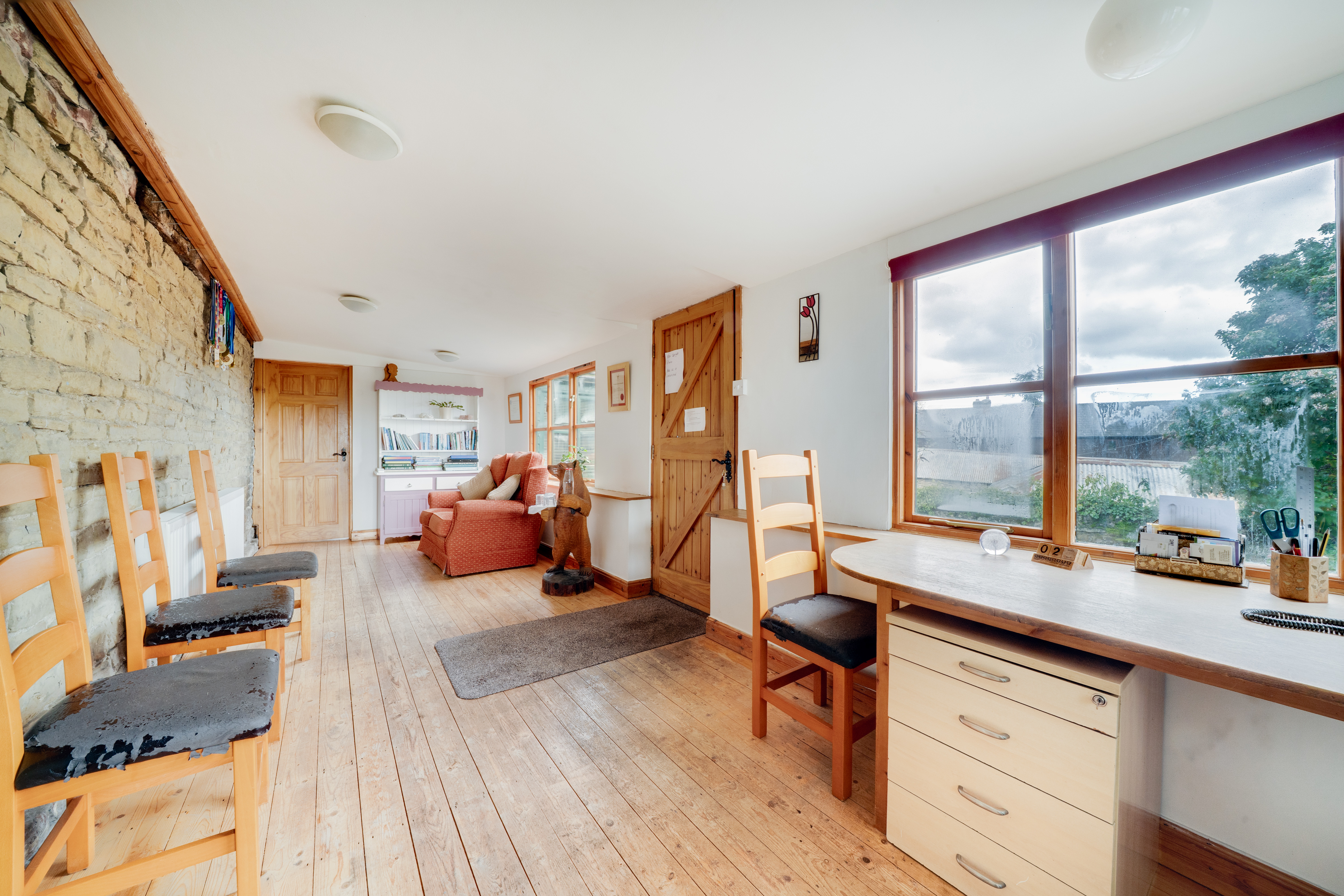 The kitchen/dining room forms the heart of the home, fitted with a range of wooden base units with work surfaces over and ample space for a dining table. Windows allow plenty of natural light while providing pleasant outlooks towards the gardens and courtyard areas, making it a sociable space for everyday family life. Leading from the kitchen is the utility room, which provides additional storage and space for appliances together with access outside. Further ground floor accommodation includes a studio/office annexe, providing a flexible space suitable for home working, creative use or hobbies, and offering potential to be adapted as a self-contained holiday let or granny annexe, subject to the necessary consents. The family bathroom is located on the ground floor and is fitted with a bath with shower over, wash basin and WC.