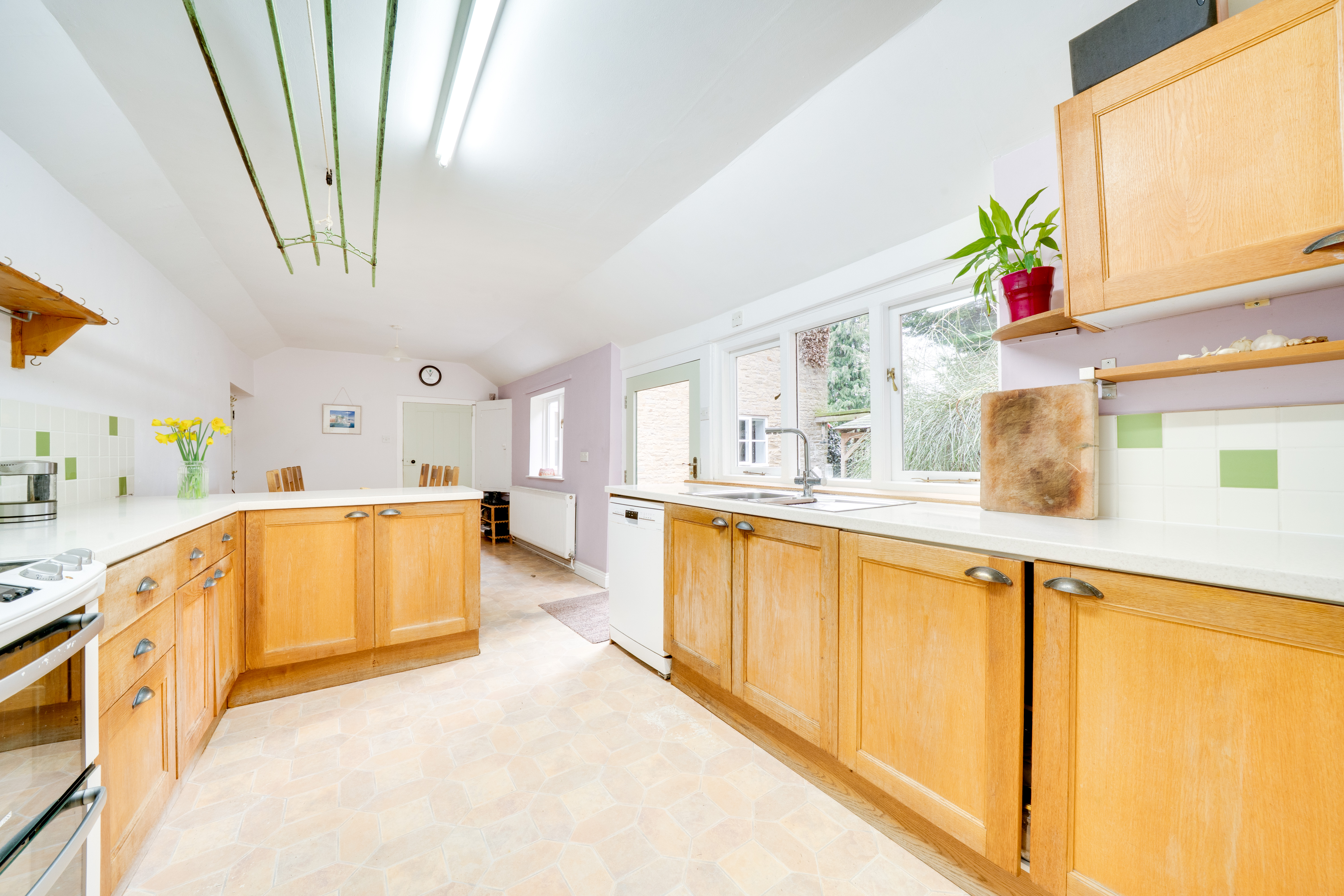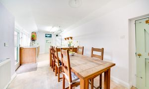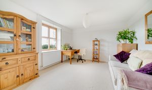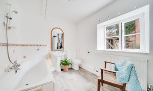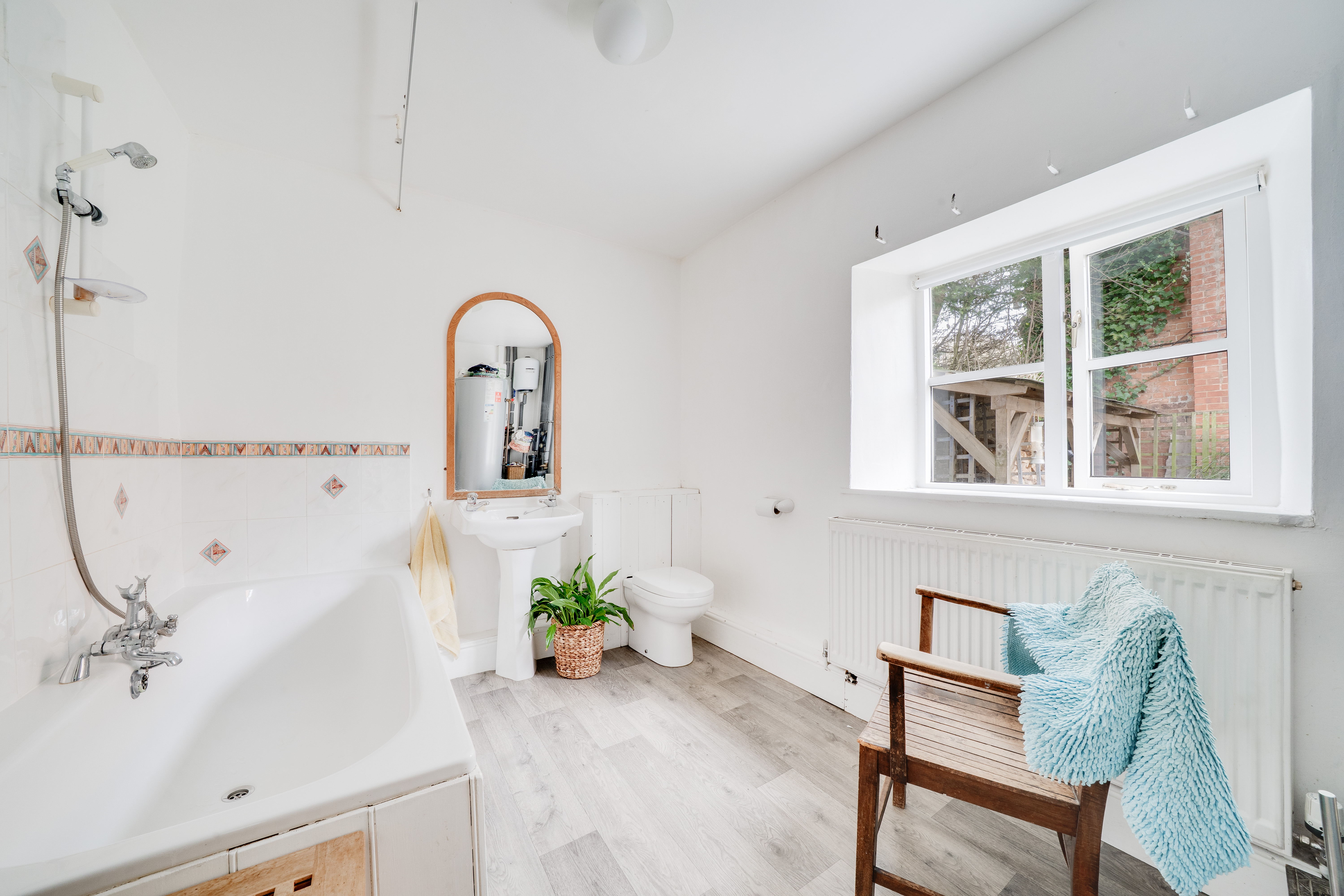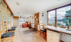 The kitchen/dining room forms the heart of the home, fitted with a range of wooden base units with work surfaces over and ample space for a dining table. Windows allow plenty of natural light while providing pleasant outlooks towards the gardens and courtyard areas, making it a sociable space for everyday family life. Leading from the kitchen is the utility room, which provides additional storage and space for appliances together with access outside. Further ground floor accommodation includes a studio/office annexe, providing a flexible space suitable for home working, creative use or hobbies, and offering potential to be adapted as a self-contained holiday let or granny annexe, subject to the necessary consents. The family bathroom is located on the ground floor and is fitted with a bath with shower over, wash basin and WC.