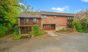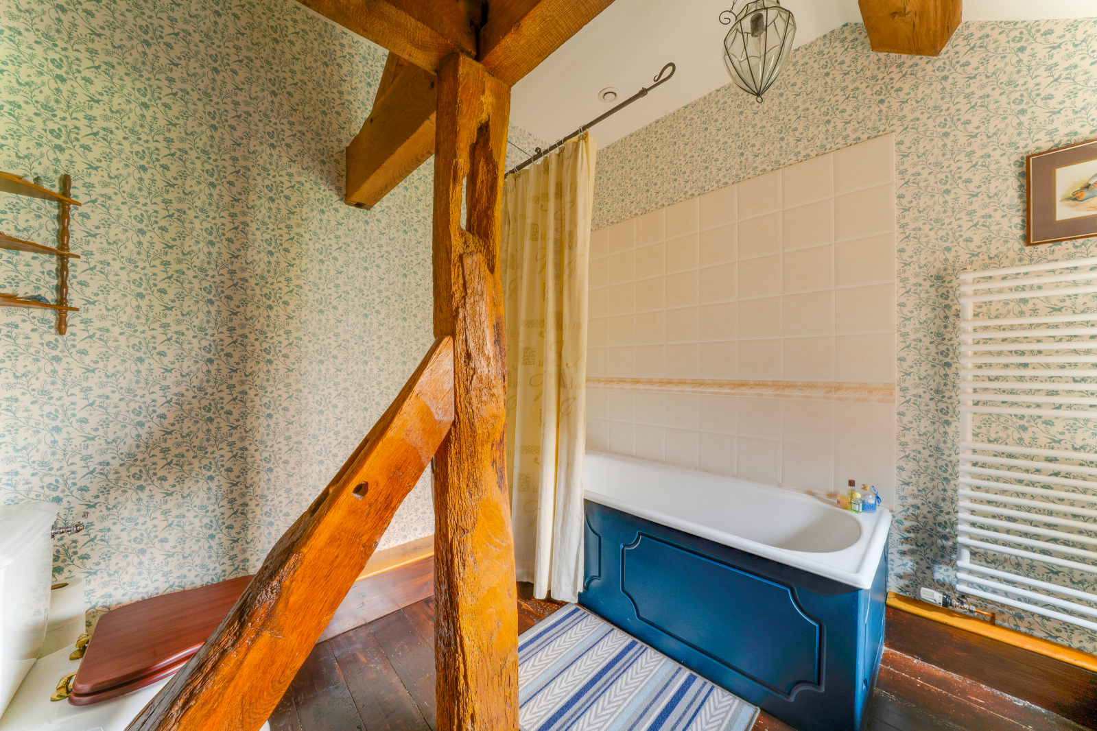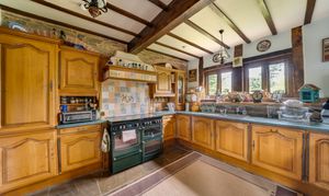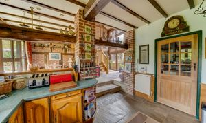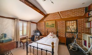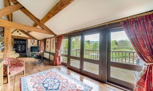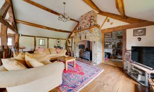 Moving upstairs into the living room, a vaulted ceiling, exposed roof trusses and a magnificent inglenook fireplace with wood-burning stove centre the room. French doors open out to a private first-floor balcony, perfectly positioned to enjoy views across the surrounding gardens and countryside. This room provides the ideal space for relaxing or entertaining, with timber flooring and rich tones contributing to the barn’s warmth and character.