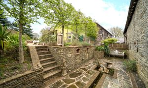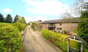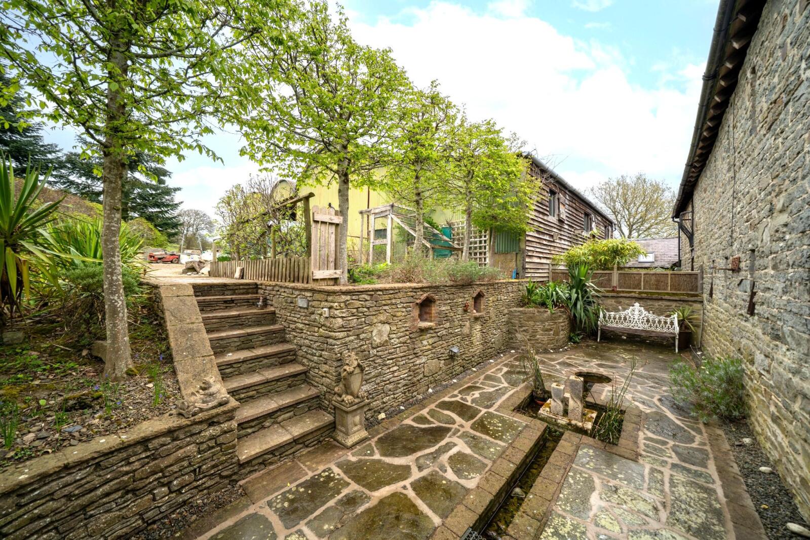The barn is surrounded by mature cottage-style gardens with planted borders, shaped lawns, and well-tended trees. Paved terraces provide private seating areas, ideal for outdoor dining and entertaining. A gravelled area offers ample parking at the rear. The grounds are thoughtfully landscaped, with secluded corners, raised beds, and stone retaining walls, while open lawned areas lead out to enjoy views over rolling countryside.