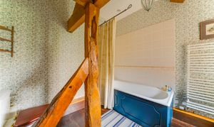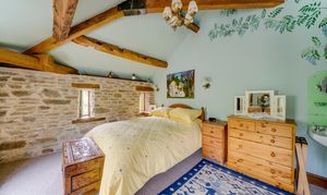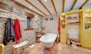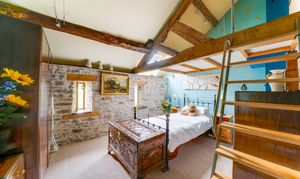 The first floor accommodation is varied and flexible with three double bedrooms. The principal bedroom features a vaulted ceiling, exposed stone walls, and a mezzanine loft area accessed via a timber staircase—ideal for additional storage or reading space. Two further double bedrooms, each individually styled with exposed timbers and brick or stone detail, share use of a generous family bathroom with bath with shower over, WC and hand basin.