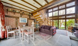 Approaching the property there is a large and useful laundry room suitable for flexible use. The property also benefits from a spacious utility room with timber shelving. Upon entering, through the utility area, is the kitchen, which is fitted with a bespoke range of wooden units, laminate worktops and a traditional freestanding electric double cooker/LPG gas range set beneath a decorative tiled surround. The kitchen enjoys dual aspect views and steps up into a breakfast/dining area. Greeted by a dramatic full-height ceiling with exposed brickwork, stone flagged flooring and a feature timber staircase rising to the first floor, this space comfortably serves as both a dining area and snug, with tall windows allowing an abundance of light to flood in.