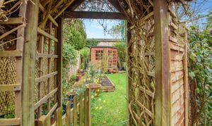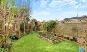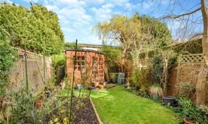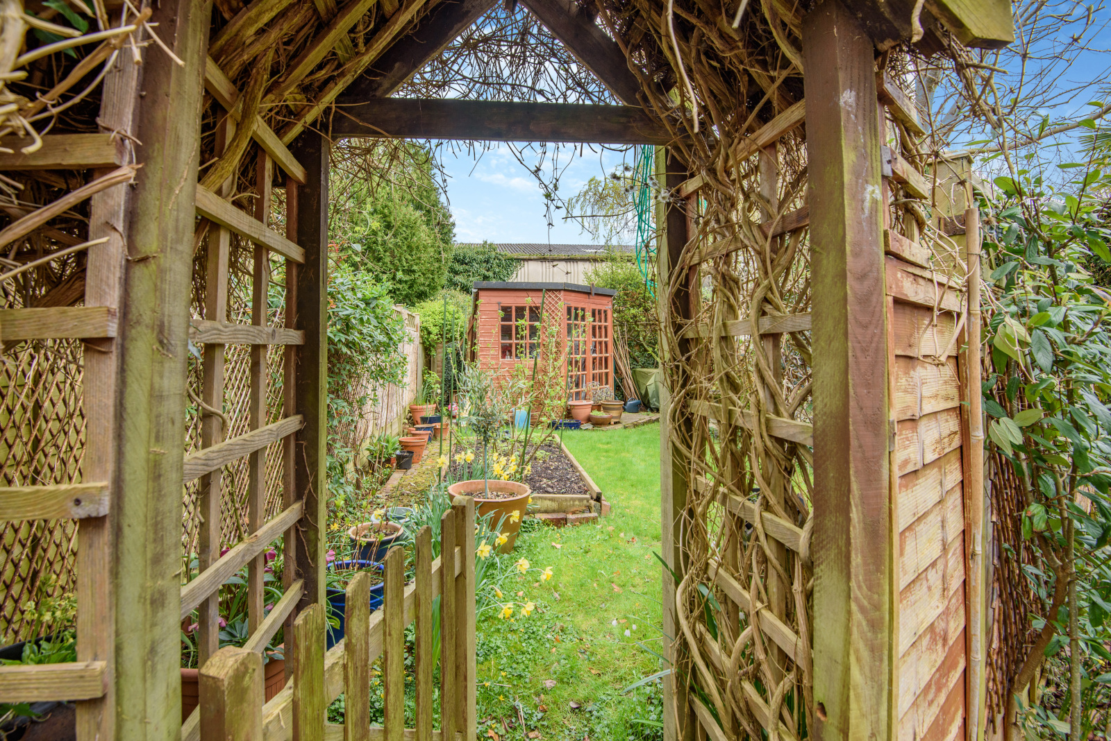 The private garden is accessed via a shared pathway past the terraced houses. The garden is mainly laid to lawn with floral borders, mature trees, and a soft fruit section, all enclosed by fencing for privacy. At the rear, there is a summer house.