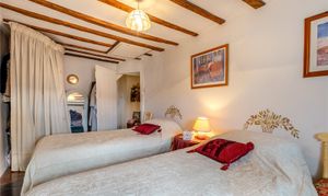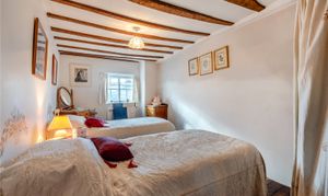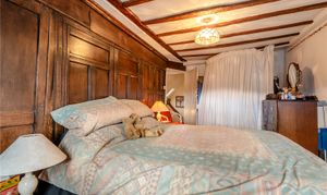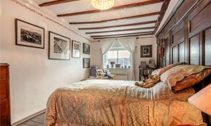 Stairs from the landing lead to the second floor, where there are two generously sized double bedrooms with character features and front-facing windows. Bedroom one has exposed floorboards, beams, and distinctive characterful wooden panelling on one wall. Bedroom two also has exposed floorboards and beams, along with access to the large loft via a drop-down ladder. The westerly view from the windows is of the corner of Linney and Whitcliffe.