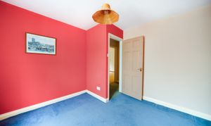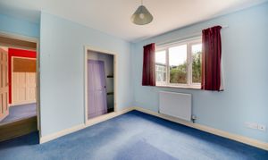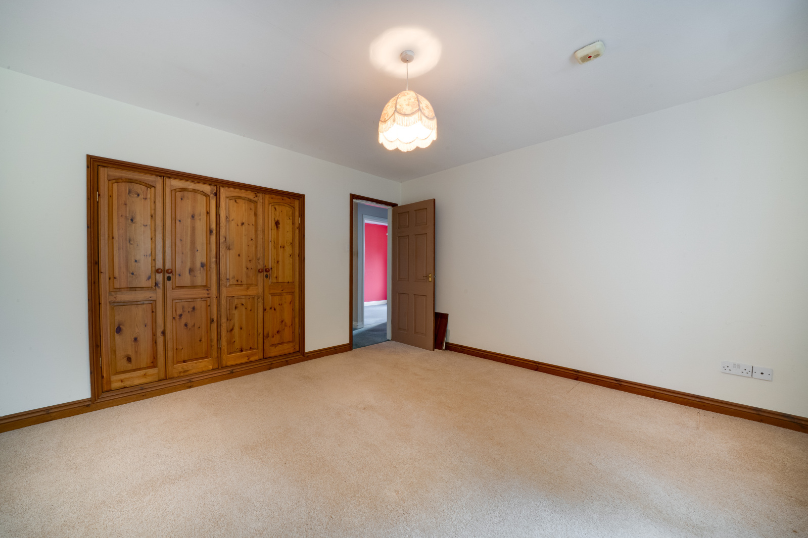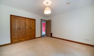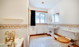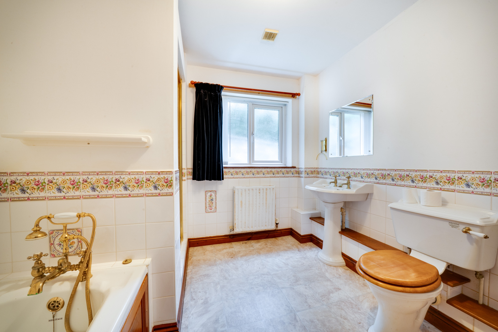 There are three bedrooms, all generously sized and offering ample storage. The principal bedroom benefits from built-in wardrobes, and all are served by a family bathroom complete with bath, separate shower, and traditional fittings.