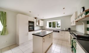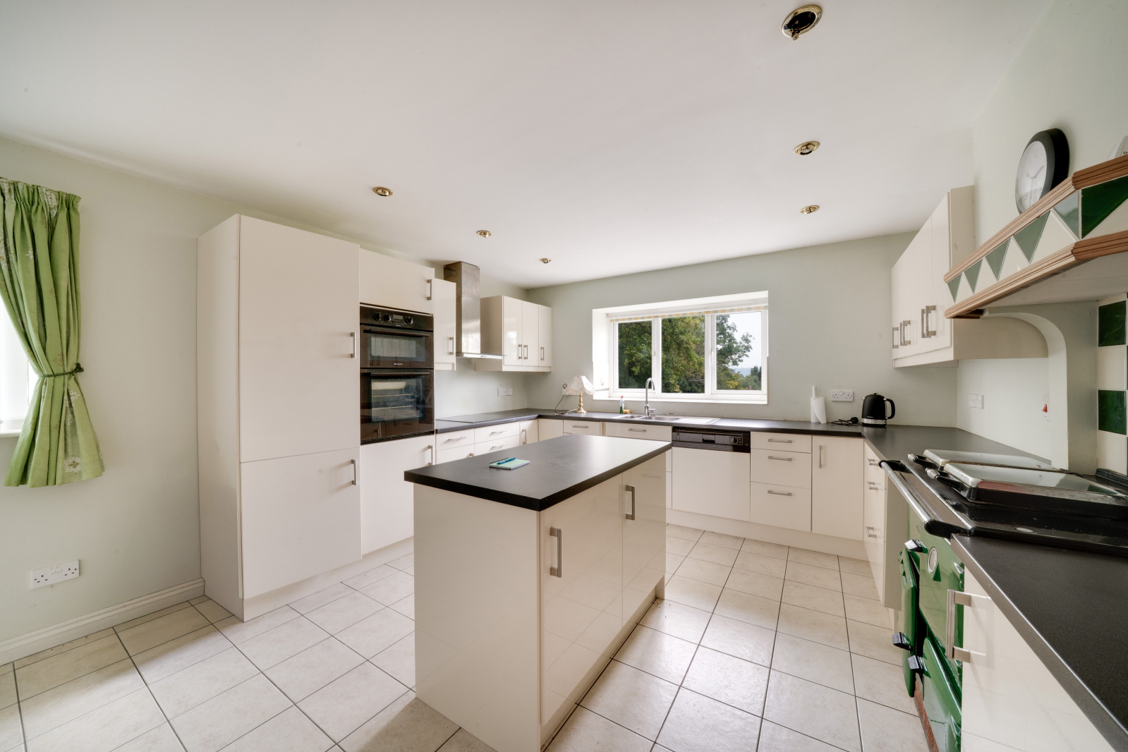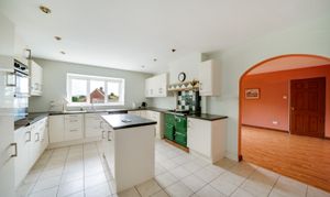An entrance hall leads into a bright and airy interior, with well-proportioned rooms throughout. The kitchen is fitted with a range of contemporary units, complemented by tiled flooring and ample work surfaces, along with an island and integrated appliances. A traditional Aga adds a touch of character, making this an inviting space for both cooking and entertaining.