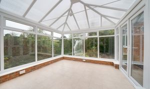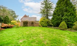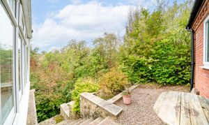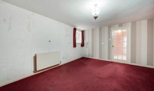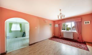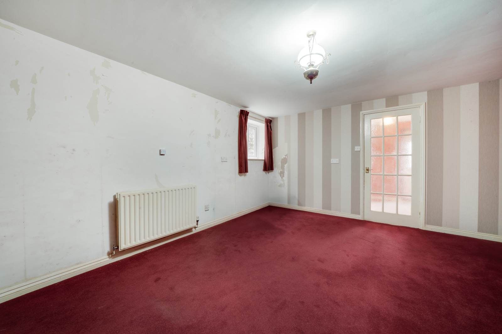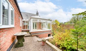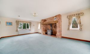 The dining room sits adjacent, providing a comfortable setting for formal meals or family gatherings, while the spacious sitting room features a striking brick fireplace with a wood-burning stove—perfect for colder evenings. From here, double doors open into the conservatory, which overlooks the surrounding greenery and provides access to the garden via external steps.