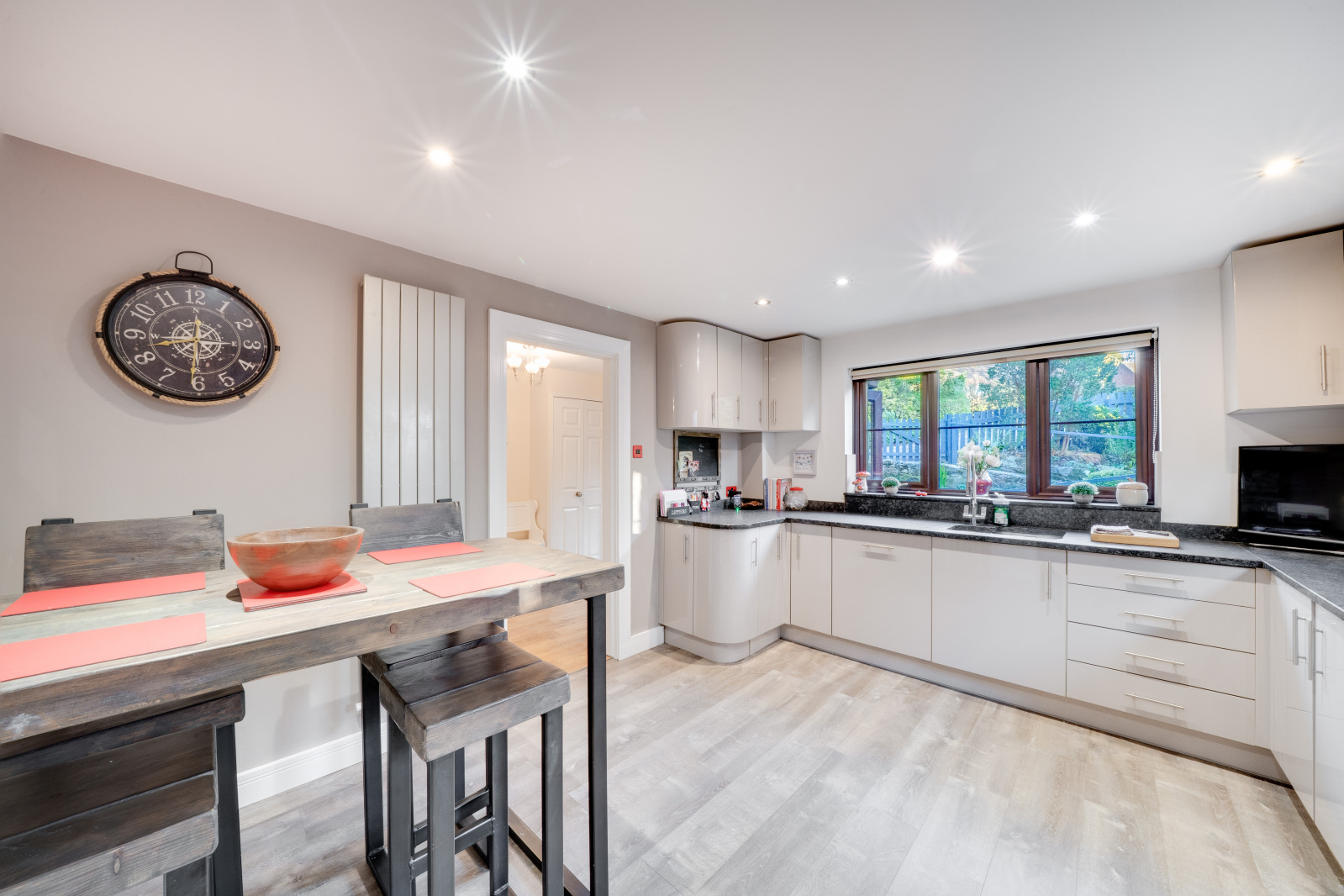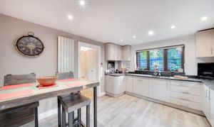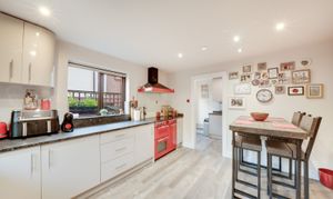 The modern kitchen is to the left of the entrance and comes well-appointed, offering ample worktop areas, fitted units and space for a breakfast table — ideal for those who enjoy cooking and entertaining. Adjacent to the kitchen is a useful utility room, offering plenty of storage and space for appliances, with access to the side of the property.