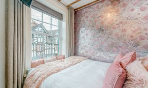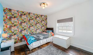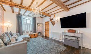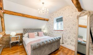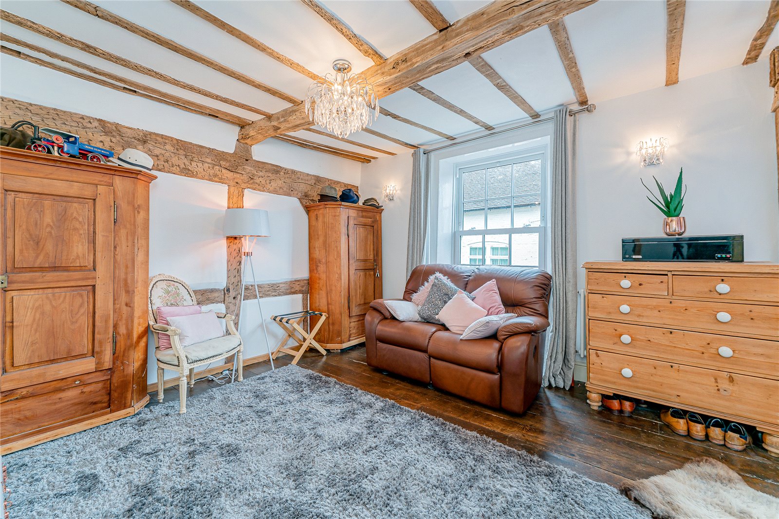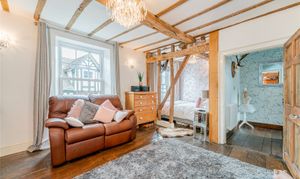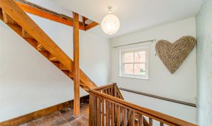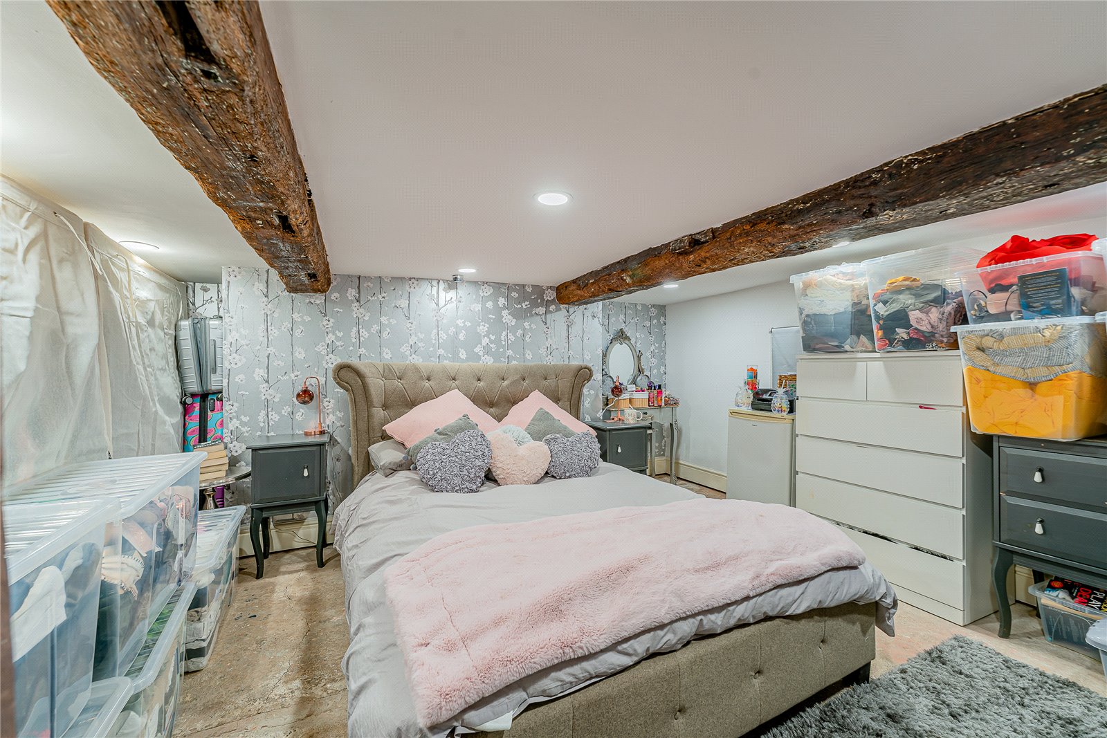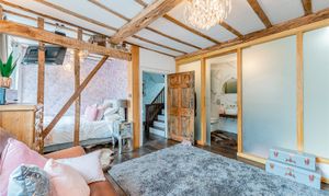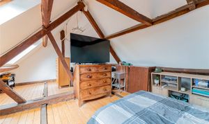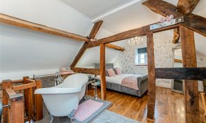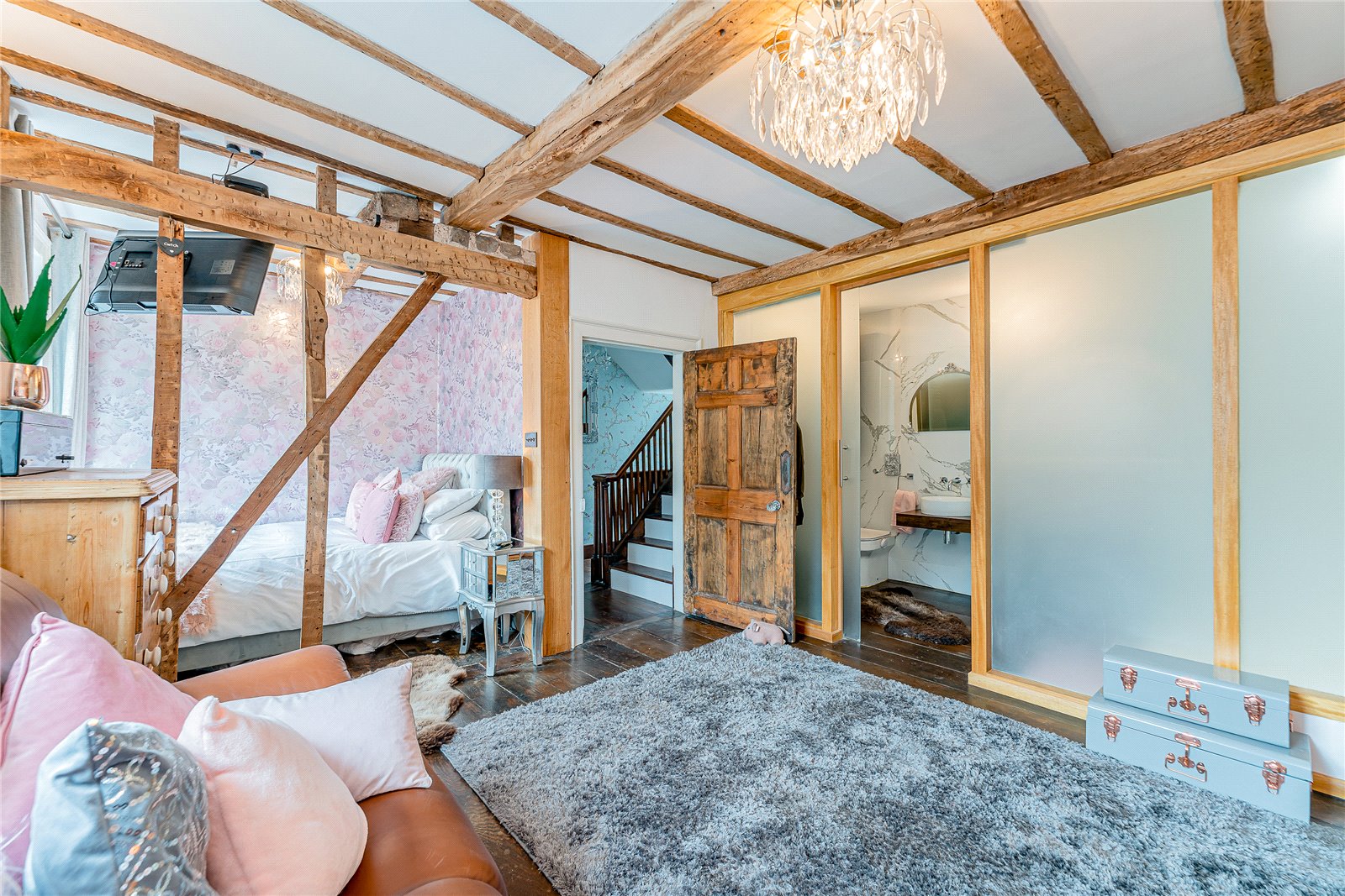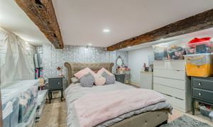 On the first floor is a spacious reception room with two large sash windows allowing an abundance of natural light into the room. This room has a cosy feel with exposed beams adding a great deal of character. Partial beams across the room separate this side from the other, which is currently used as a bedroom. The bathroom off the reception room has been cleverly converted with frosted glass partion still allowing light to enter. It is modern with large walk in rainfall shower, his and hers sinks and wc.