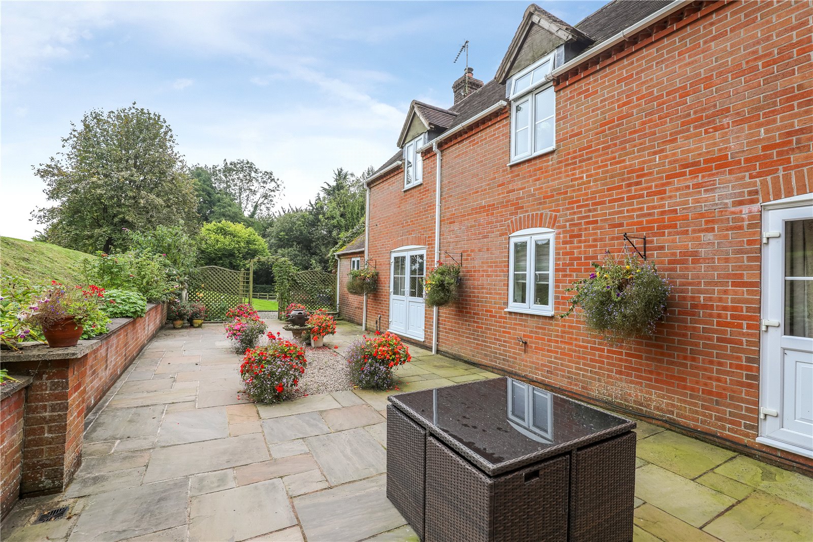 As you approach the property via the driveway, you'll find ample parking for multiple vehicles. The front of the property features a well-maintained garden and a charming stream. To the rear, there is a formal patio, accessible through two sets of double doors, making it an ideal space for entertaining. Beyond the patio, a field extends to the rear of the property, offering the potential for small livestock.