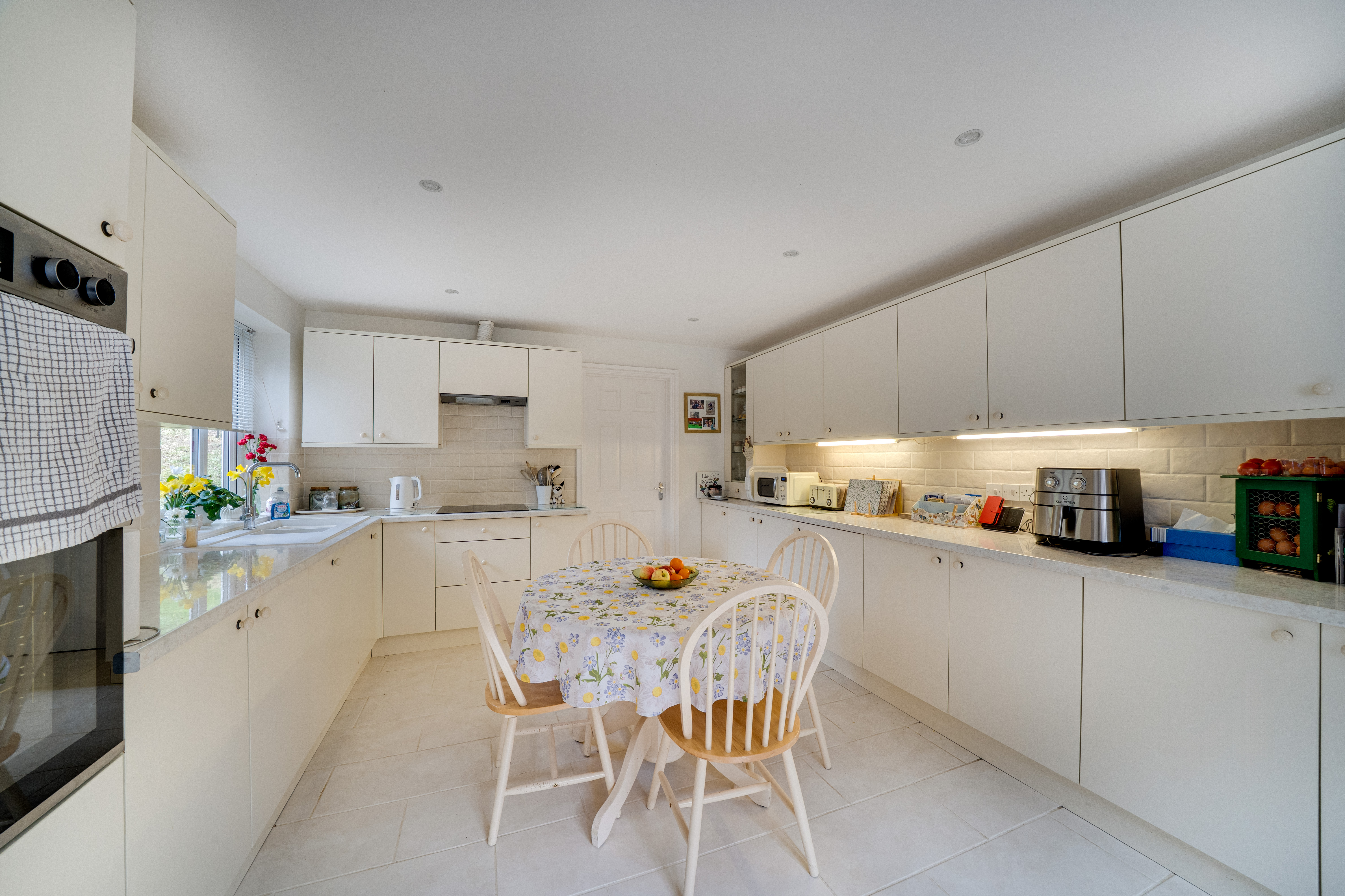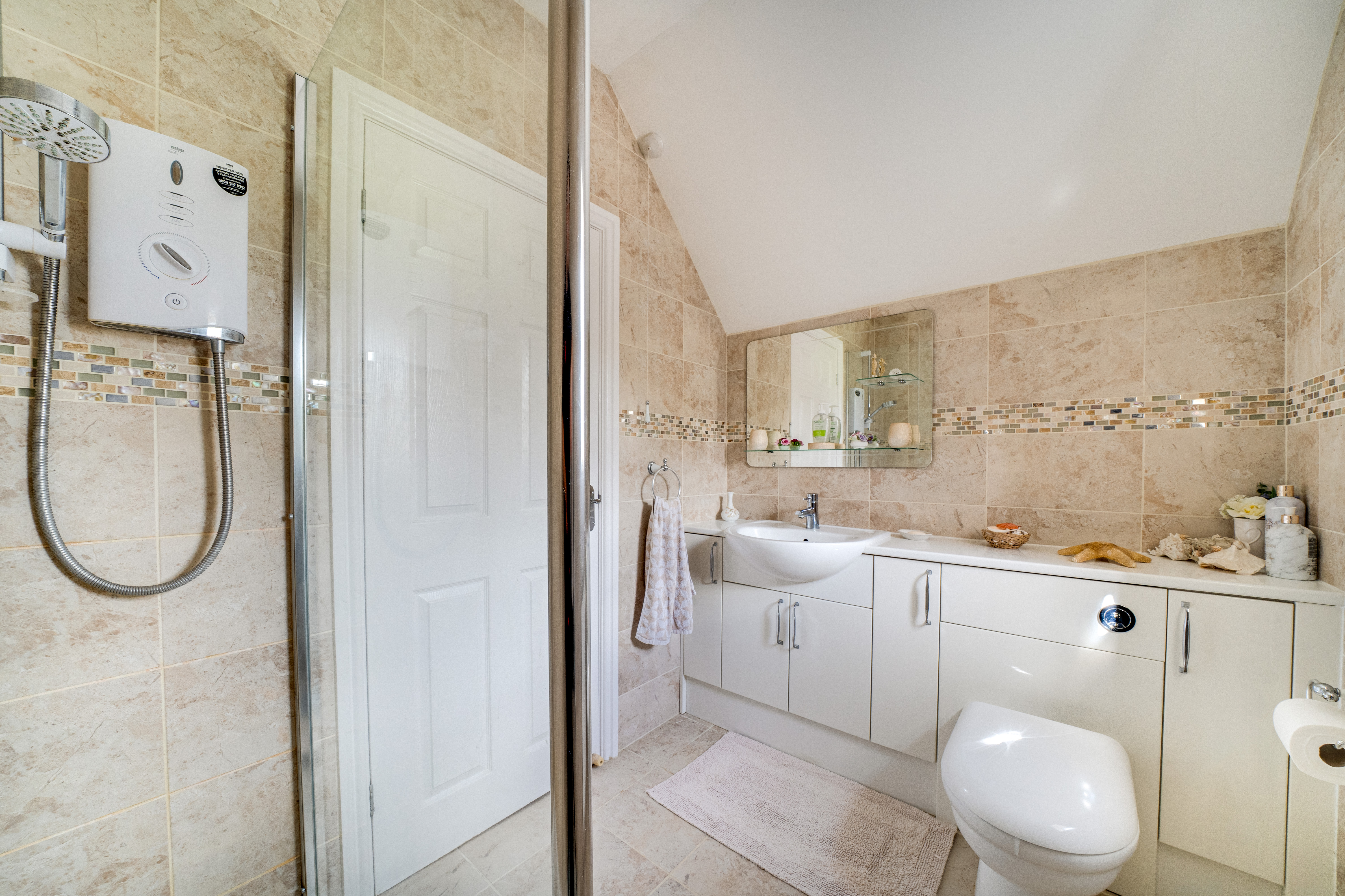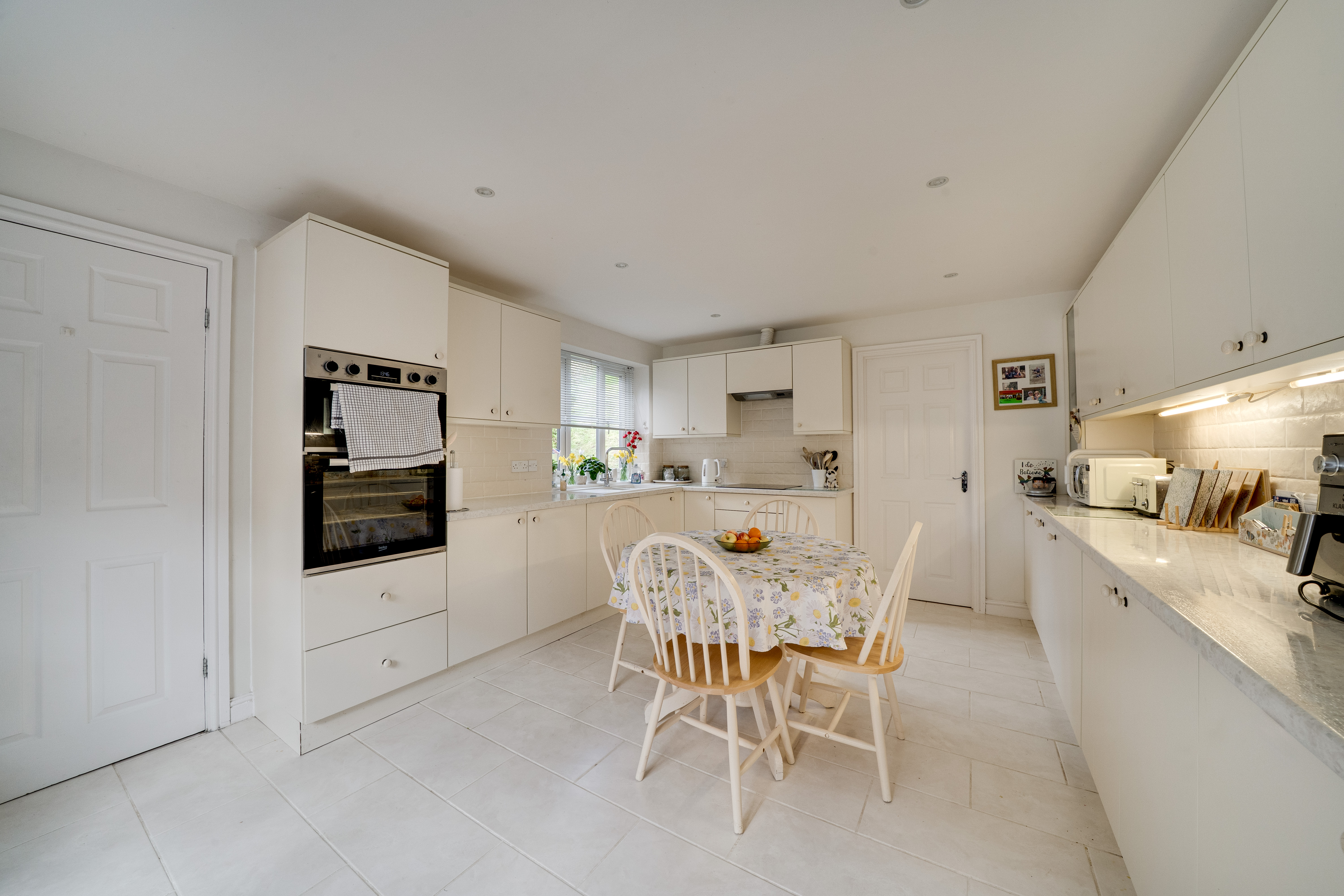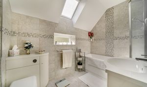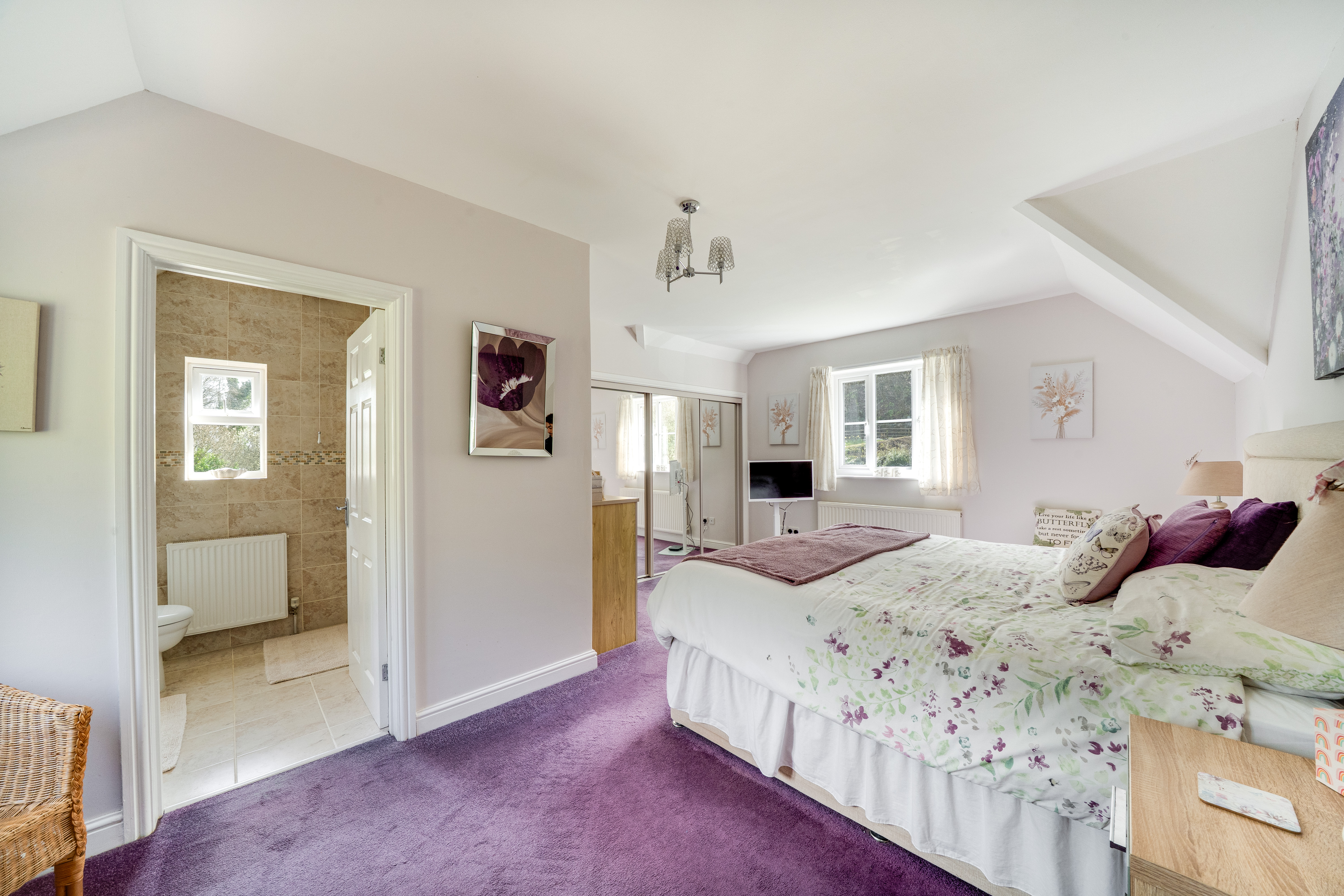 The staircase in the hallway leads you to four inviting bedrooms and the family bathroom, each providing unique views of the property. The bedrooms and upstairs hallway are fully carpeted, creating a warm and cosy atmosphere. The principal bedroom features its own ensuite for added convenience. The family bathroom is well-appointed, complete with a bath and overhead shower, as well as a WC and hand wash basin.