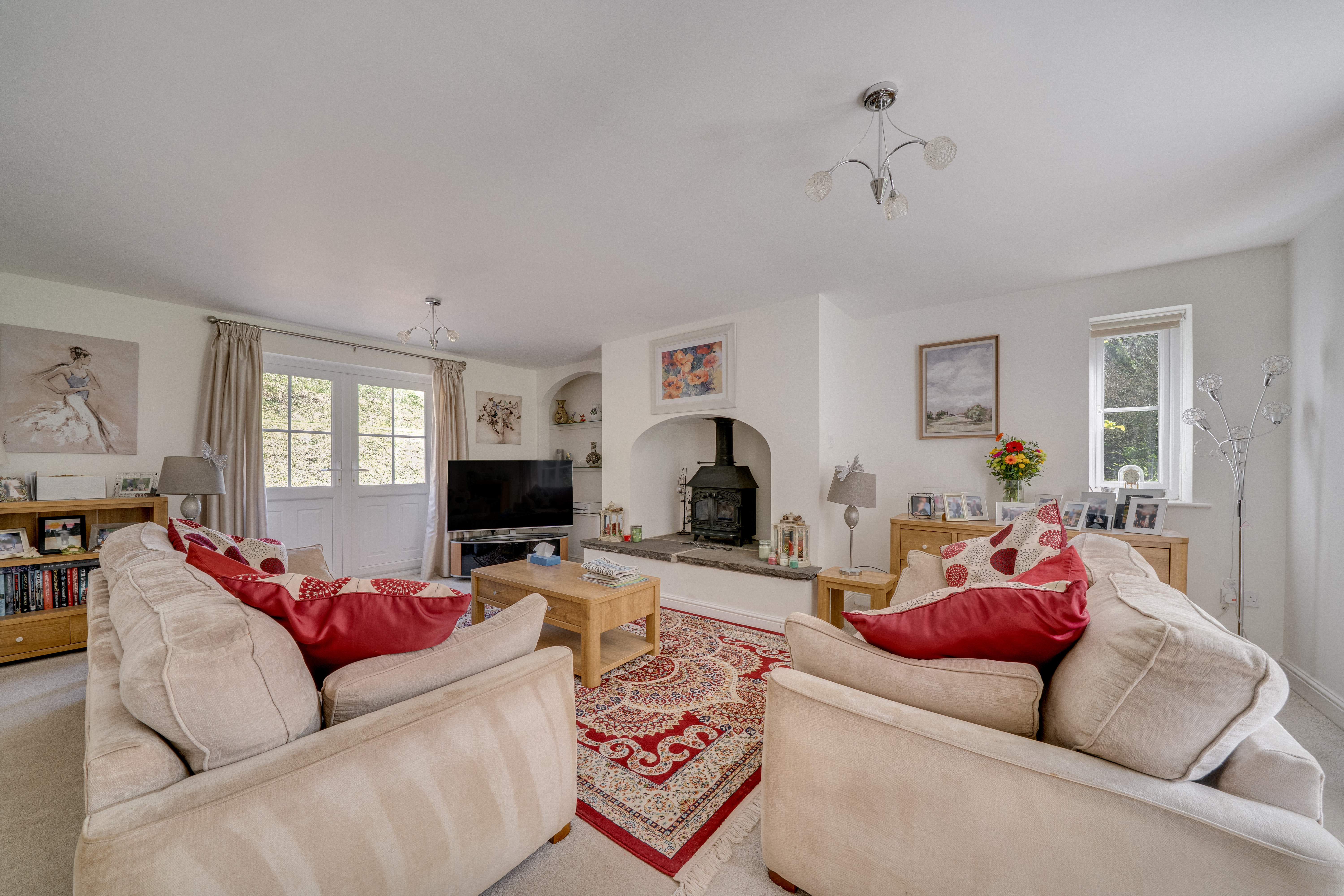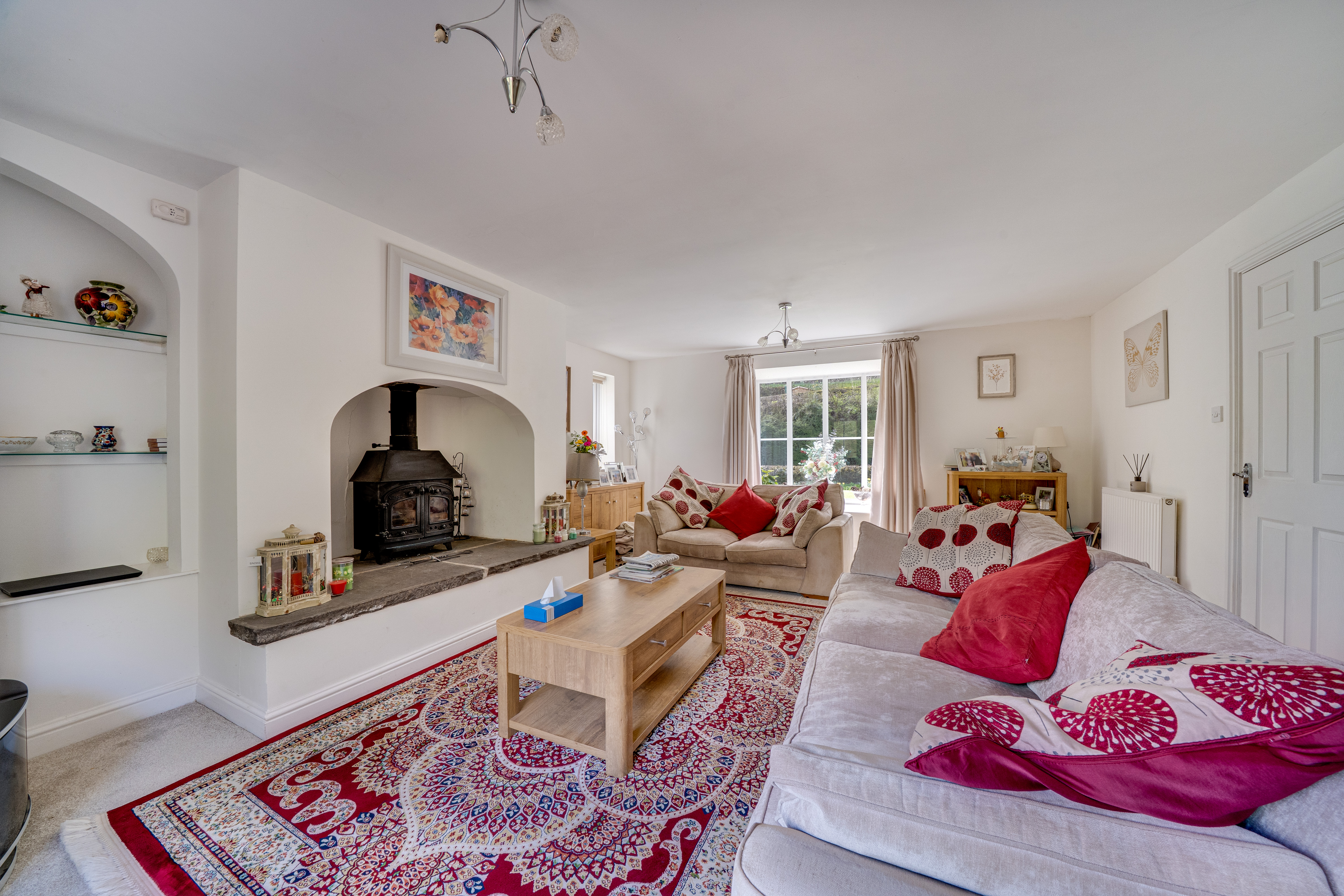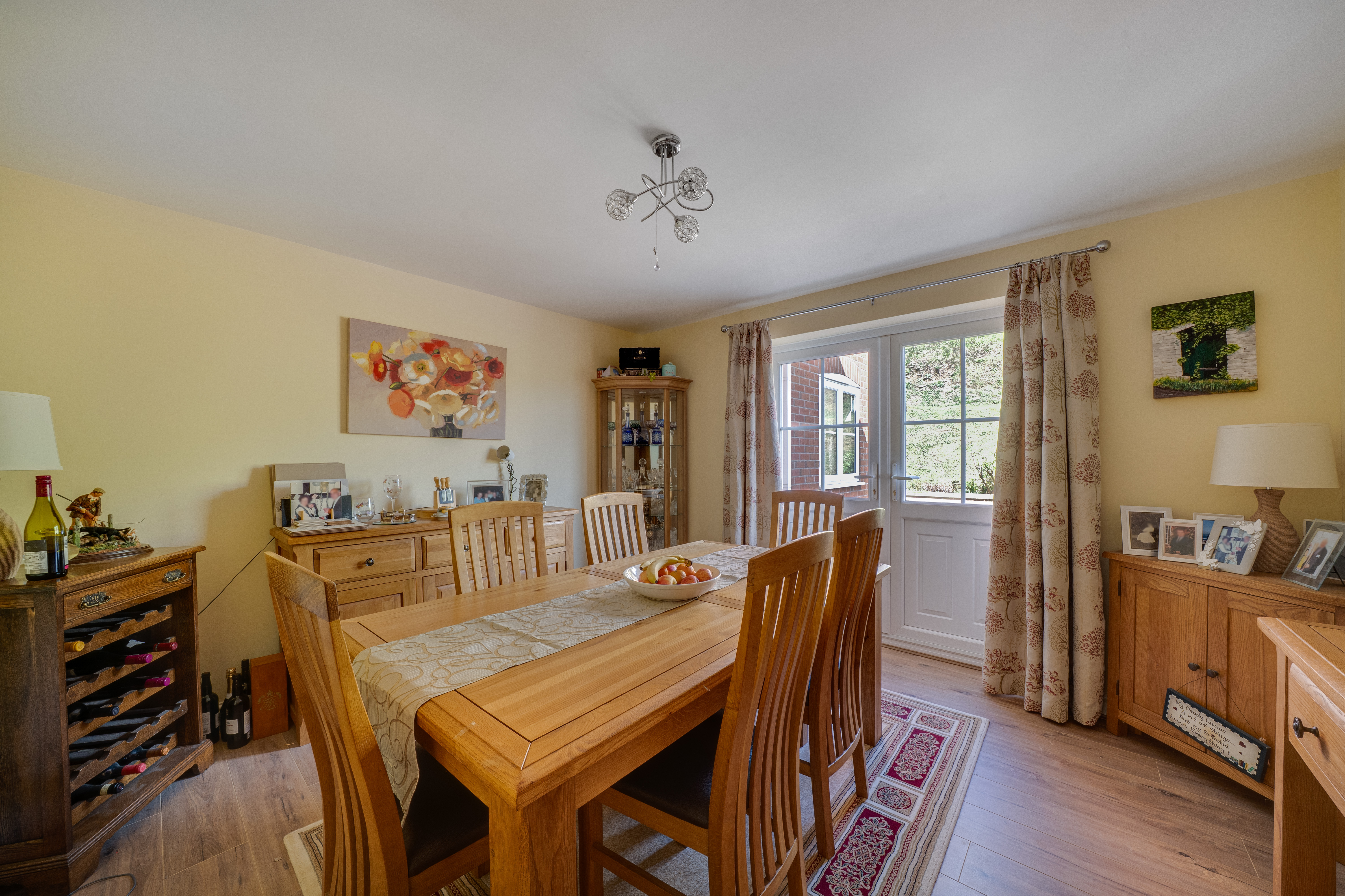 Stepping into the property's spacious entrance hall, you are welcomed by delightful, carpeted flooring that seamlessly flows into the formal dining room, which is bathed in natural light through double doors that open onto the patio area. The expansive living room, also featuring double doors, is filled with light and boasts a tastefully designed open fireplace as a stunning centrepiece. Continuing along the hall, a doorway to the right leads into the kitchen, which connects to the snug. From the kitchen, you have access to the utility room and the double garage a WC is also located on the ground floor.
