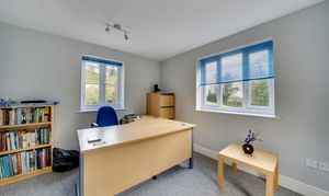 Stepping outside the property, you'll find the entrance to the generously sized home office. Nearby is the double garage, which offers convenient external access to the space above via a staircase, making it ideal for additional storage.