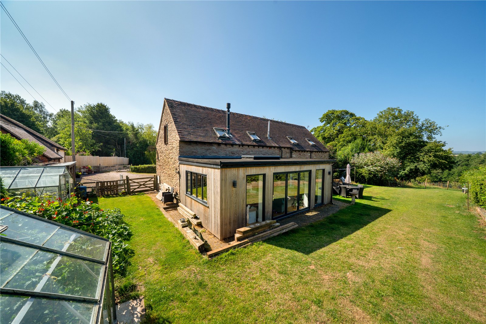 This delightful four bedroom detached barn conversion is brimming with character and positioned at the head of a small development offering generous parking and private gardens.Badgers Barn offers flexible family accommodation which is set to suit a range of buyers, enhanced by a large extension to the rear opening out onto the garden. Stottesdon is a popular country village just under 10 miles from Bridgnorth and 12 miles West of Kidderminster with amenities including primary school and a village pub.Accommodation comprises a welcoming hallway with guest cloaks/ WC and staircase to the first floor. The spacious living room offers a feature fireplace with woodburning stove, and double doors leading into a fabulous family room with atrium roof light and both bi-fold and French doors leading out to the garden, perfect for entertaining in the summer months.Flagtone flooring flows from the hallway into an impressive open plan dining room and kitchen, ideal for modern family living. The kitchen is fitted with a range of wall and base units with inset sink unit, matching worktops and space for a range cooker. Just off the kitchen is a matching utility with space for white goods and a stable door leading out to the garden.The first floor landing offers a wealth of exposes beams and timbers on display and leads to three of the four well-proportioned bedrooms. Bedroom four can be accessed via the third bedroom’s interconnecting door, or from its own spiral staircase which leads off the living room, ideal for those looking for independent bedroom accommodation. There is an en-suite shower room, in addition to a family bathroom with both bath and shower cubicle.Externally, Badgers Barn is situated at the end of a small development of just three barns. The property is approached via a gated driveway offering generous parking and leads to the double garage. The property offers excellent gardens that extend to the side and rear of the property comprising level lawns, paved patio, vegetable garden, two greenhouses and log stores. The far reaching views to the rear must be viewed to be fully appreciated.