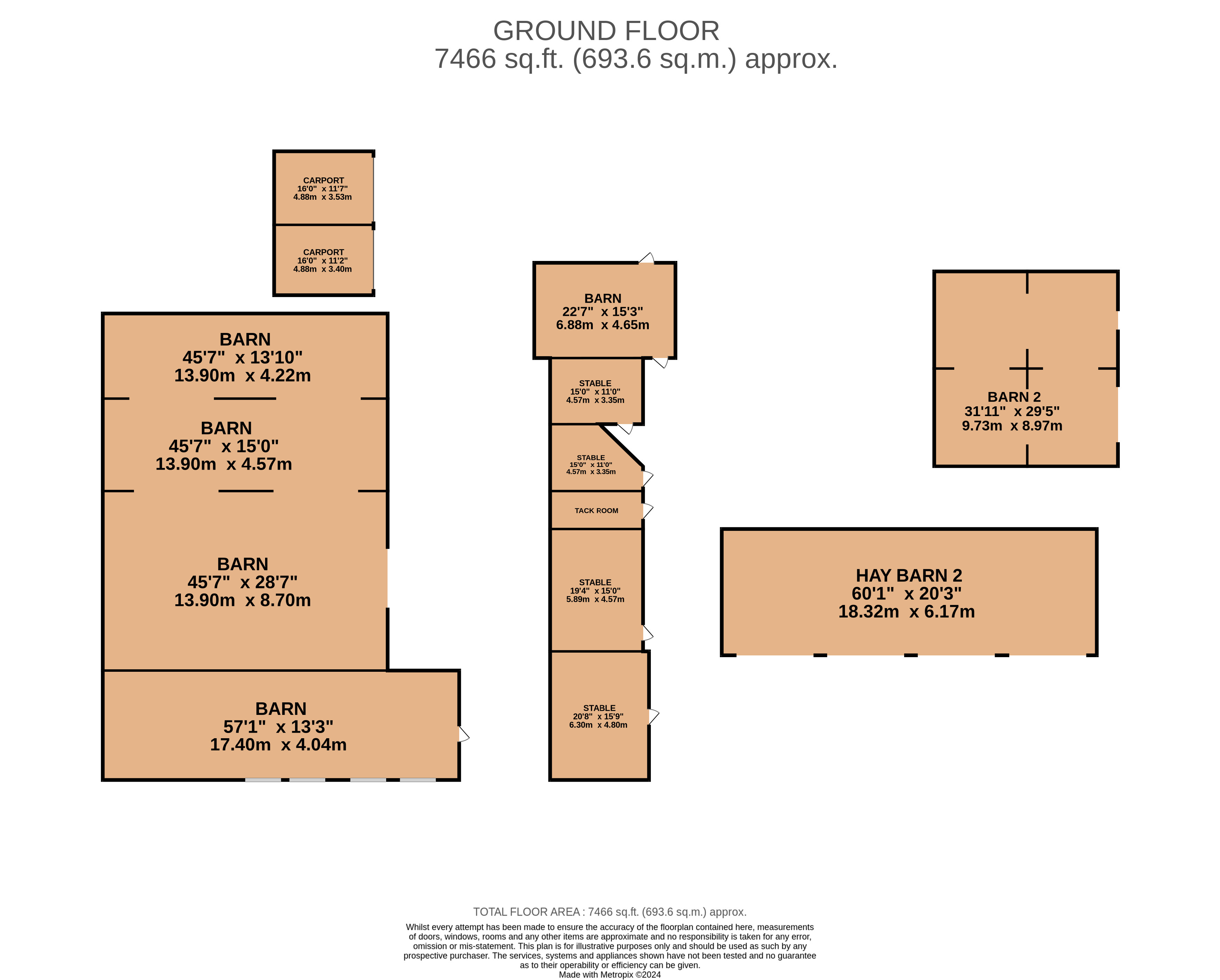 There are a number of further outbuildings including a fodder barn, a a three-bay Dutch barn with lean-to, loose boxes, a single-storey barn with conversion potential (subject to planning), and a modern four-bay general-purpose barn. The vendor has advised that a new electricity supply has recently been connected to the carport, second barn and stables, including new LED lighting and security lights.