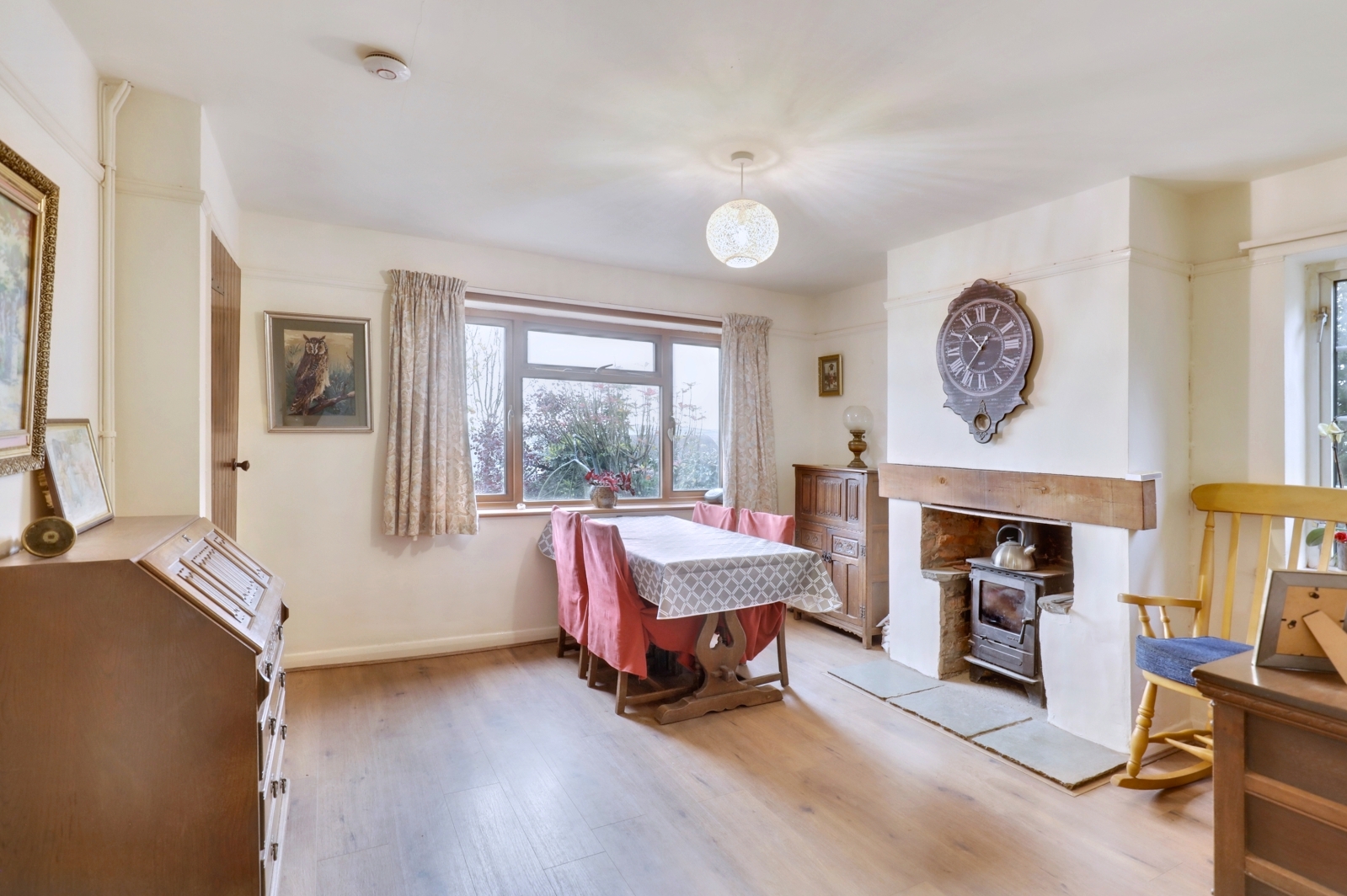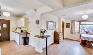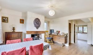The opposite side of the hallway is the dining room, which has a large archway through to the kitchen. It is a lovely open space with ample room for a dining table. A fireplace houses another woodburning stove with flagstone hearth and Oak mantle over. Between the dining room and kitchen is a breakfast bar offering space for stools beneath.