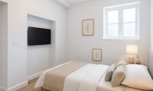 There are two well-proportioned bedrooms. The principal bedroom benefits from built-in wardrobe storage and is complemented by an en-suite shower room fitted with a shower cubicle, wash hand basin, WC and heated towel rail. The second bedroom is a flexible space, equally suitable for use as a guest bedroom, home office or additional living accommodation.