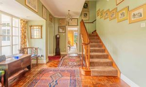 A large, impressive front door opens into a welcoming entrance hall with beautiful parquet flooring, leading through elegant glass-panelled double doors into a grand central hallway. The central hallway is a striking feature of the home, boasting high ceilings, a large panel window that floods the space with natural light, and a beautifully crafted wooden staircase that adds warmth and character.