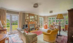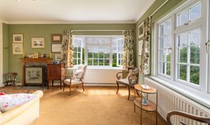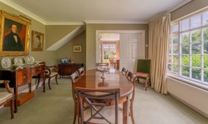 The character of the home continues into the sitting room, which boasts two elegant floor-length windows and a set of patio doors that open out to the extensive garden. A charming classic fireplace adds a warm and inviting focal point to this spacious living area.
