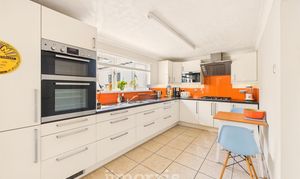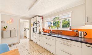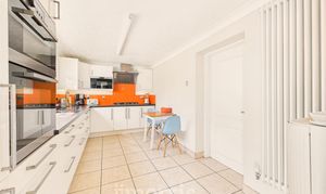 Fitted with a range of wall and base units with work surfaces over, incorporating a built-in fridge/freezer, eye-level oven and grill, five-ring gas hob, 1½ bowl sink with drainer, and built-in microwave. Finished with tiled flooring, a double-glazed window to the rear, and a door leading to: