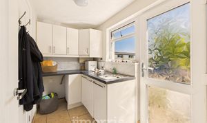 Fitted with wall and base units with work surface over, incorporating a single drainer sink and plumbing for a washing machine. Finished with continuous tiled flooring, an external frosted double-glazed door to the rear, a double-glazed rear window, and a door leading to: