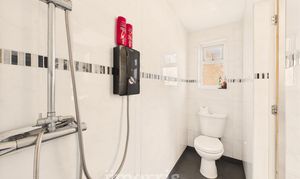 Fitted with an electric shower and WC, with frosted double-glazed side windows, and finished with tiled walls and flooring.