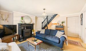 Multi-fuel stove set within an attractive surround, double-glazed sash windows to the front, staircase leading to the first floor, wood flooring, radiators, and doors opening to: