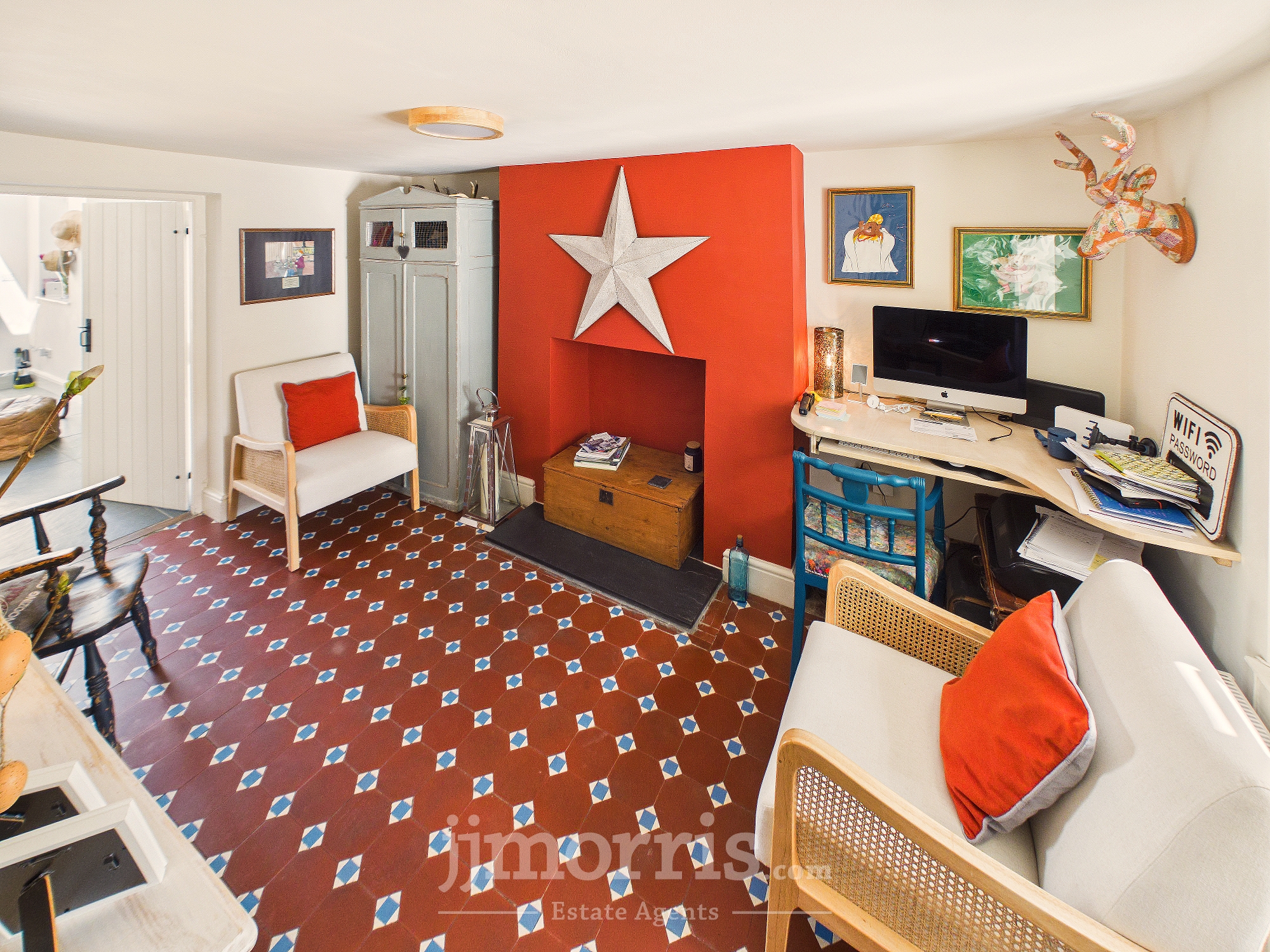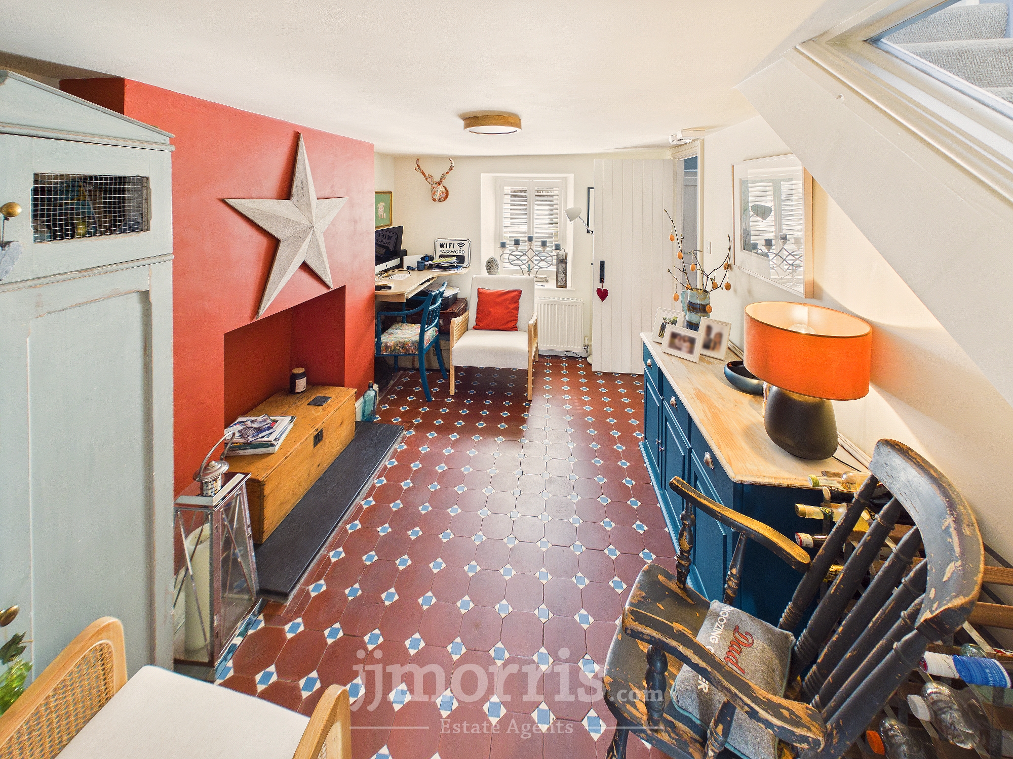 (maximum). With quarry tiled floor, fireplace opening with slate hearth, double panelled radiator, double glazed sash window with wooden shutters, mains smoke detector, carbon monoxide alarm, fitted work desk, TV point, 8 power points, window to stairwell, understairs storage cupboard, ceiling light and door to:-