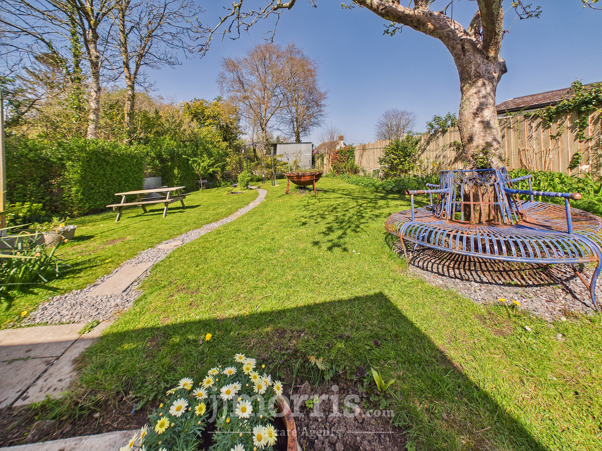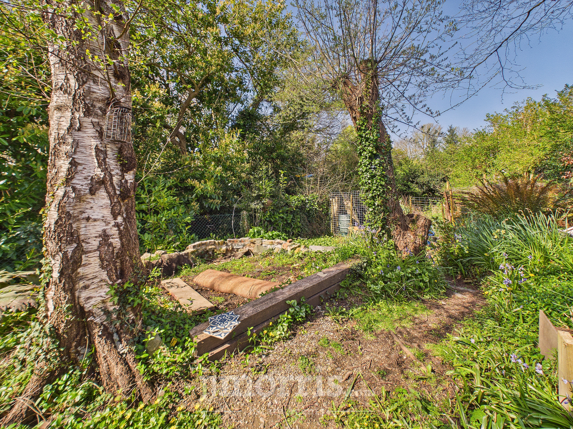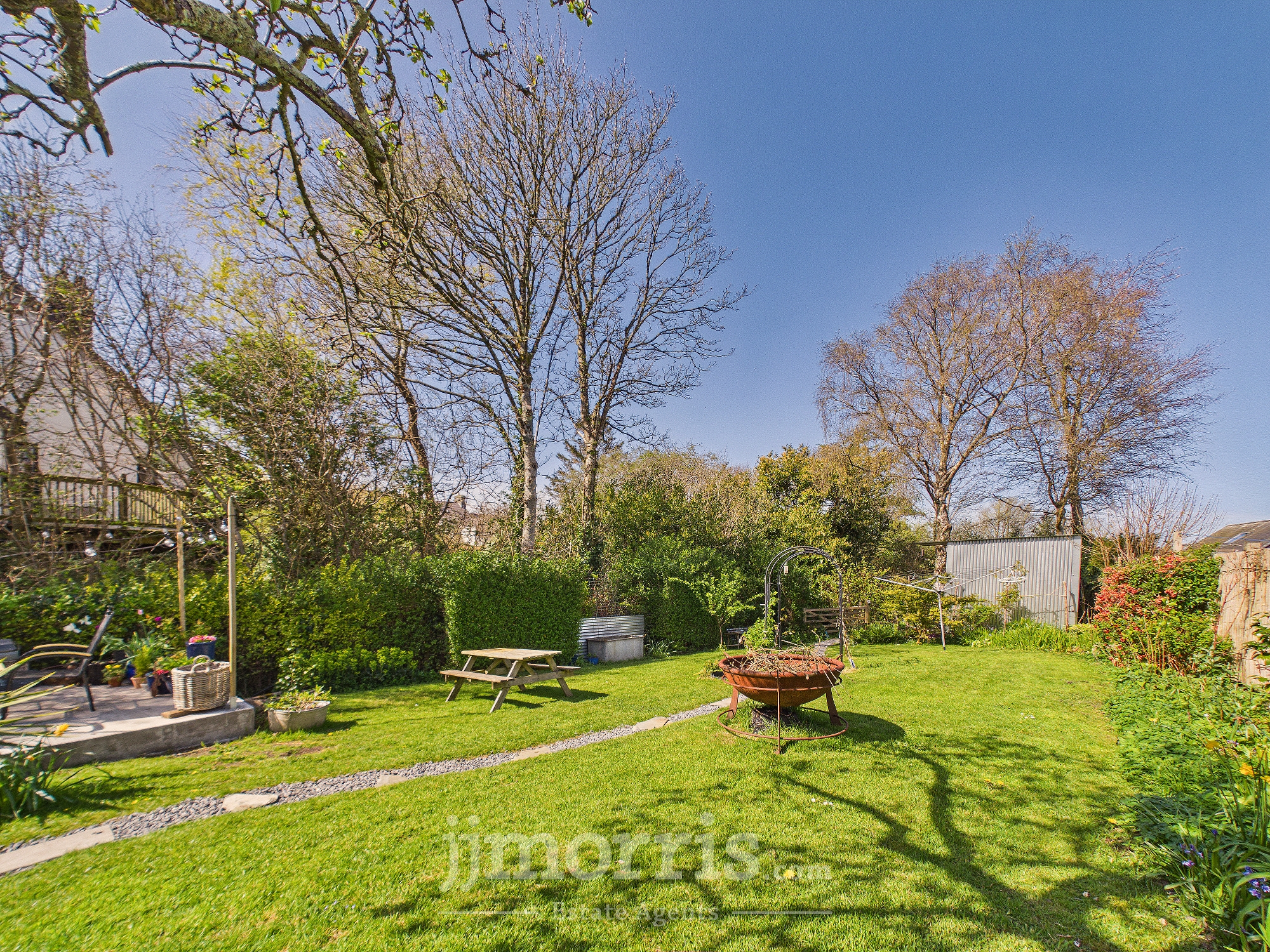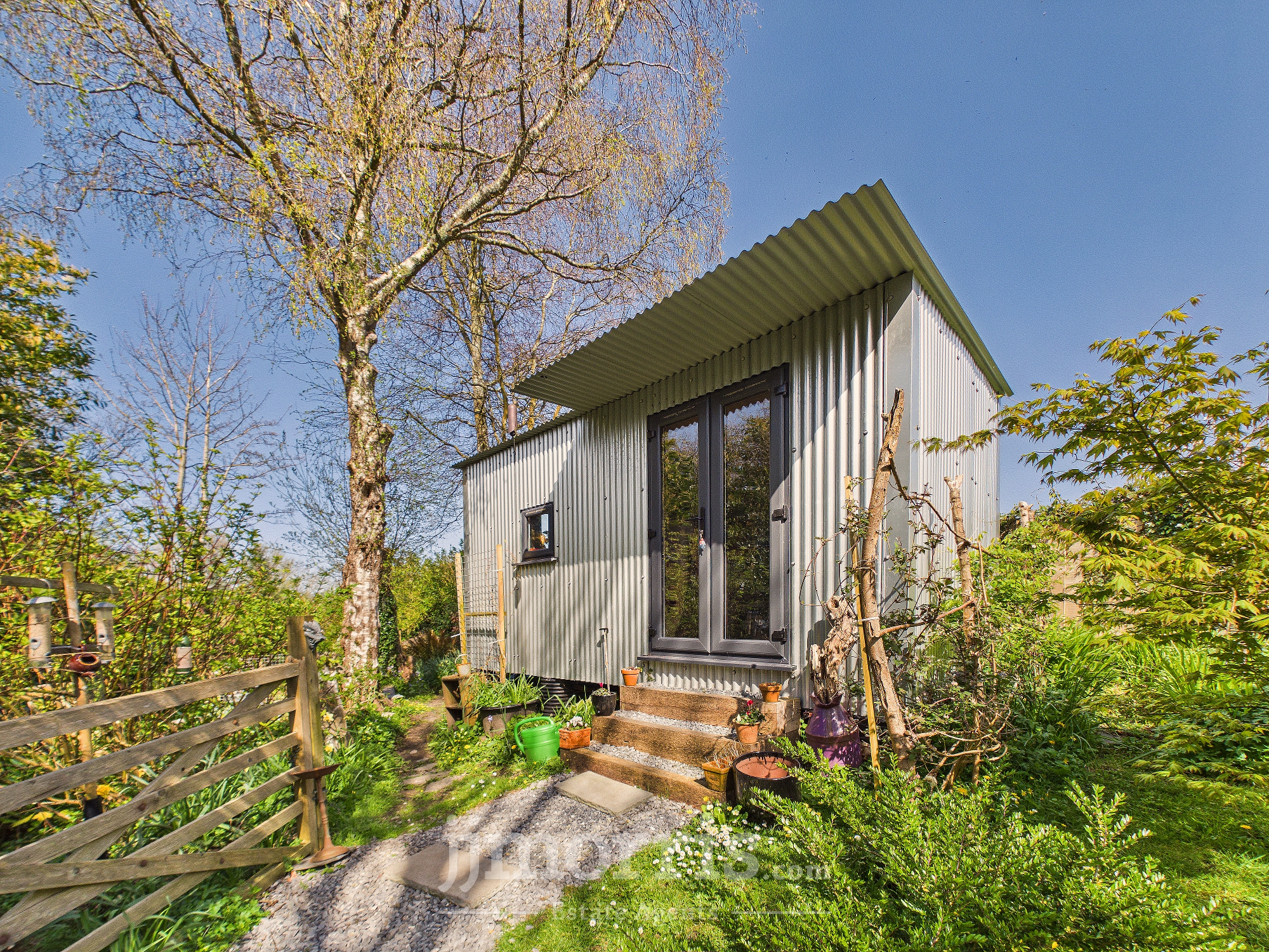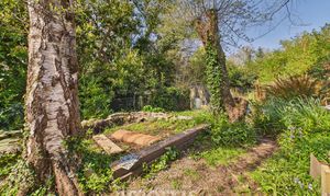 (approx). Of concrete block construction with a corrugated iron roof. It has double wooden doors, wall shelves, 2 power points, a ceiling light, pedestrian door to rear garden, gas meter and a Worcester wall mounted Gas Combination Boiler (heating domestic hot water and firing central heating). To the rear of the Property is a large Concreted Patio area and beyond in a good sized Lawned Garden with Apple and Plum Trees, Flowering Shrubs and Mature Trees. The Garden is bounded on the western side by a fenced off stream (at a much lower level). A Slate and Chipping Path bisects the Garden and leads to a:-