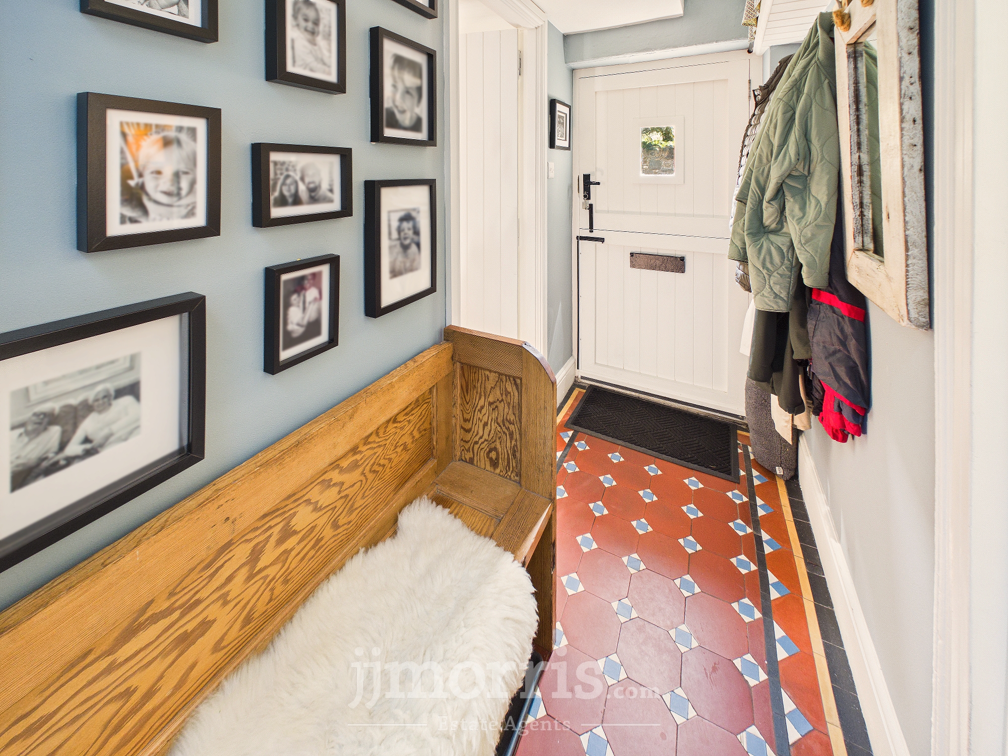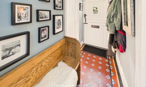With quarry tile floor, mains smoke detector, ceiling light, wall cupboard housing electricity meter and consumer unit, painted pitch pine staircase to First Floor, coat hooks and doors to Dining Room and:-