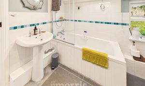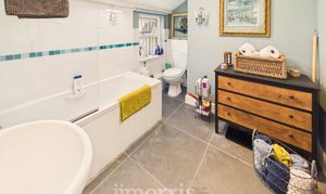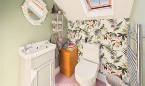 With painted Pine floorboards, Velux window, white suite of WC and Wash Hand Basin in a vanity surround, Manrose extractor fan, ceiling light, Chrome electrically heated towel rail/radiator and a Velux window.