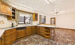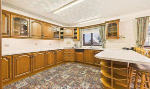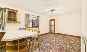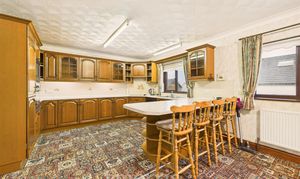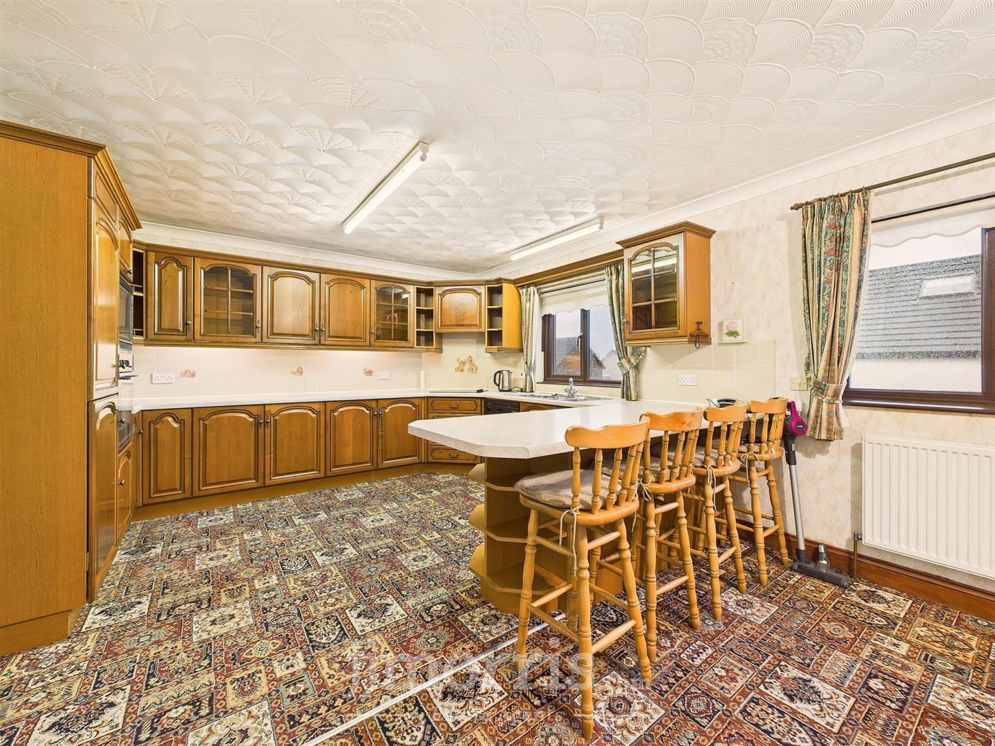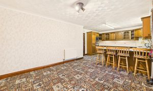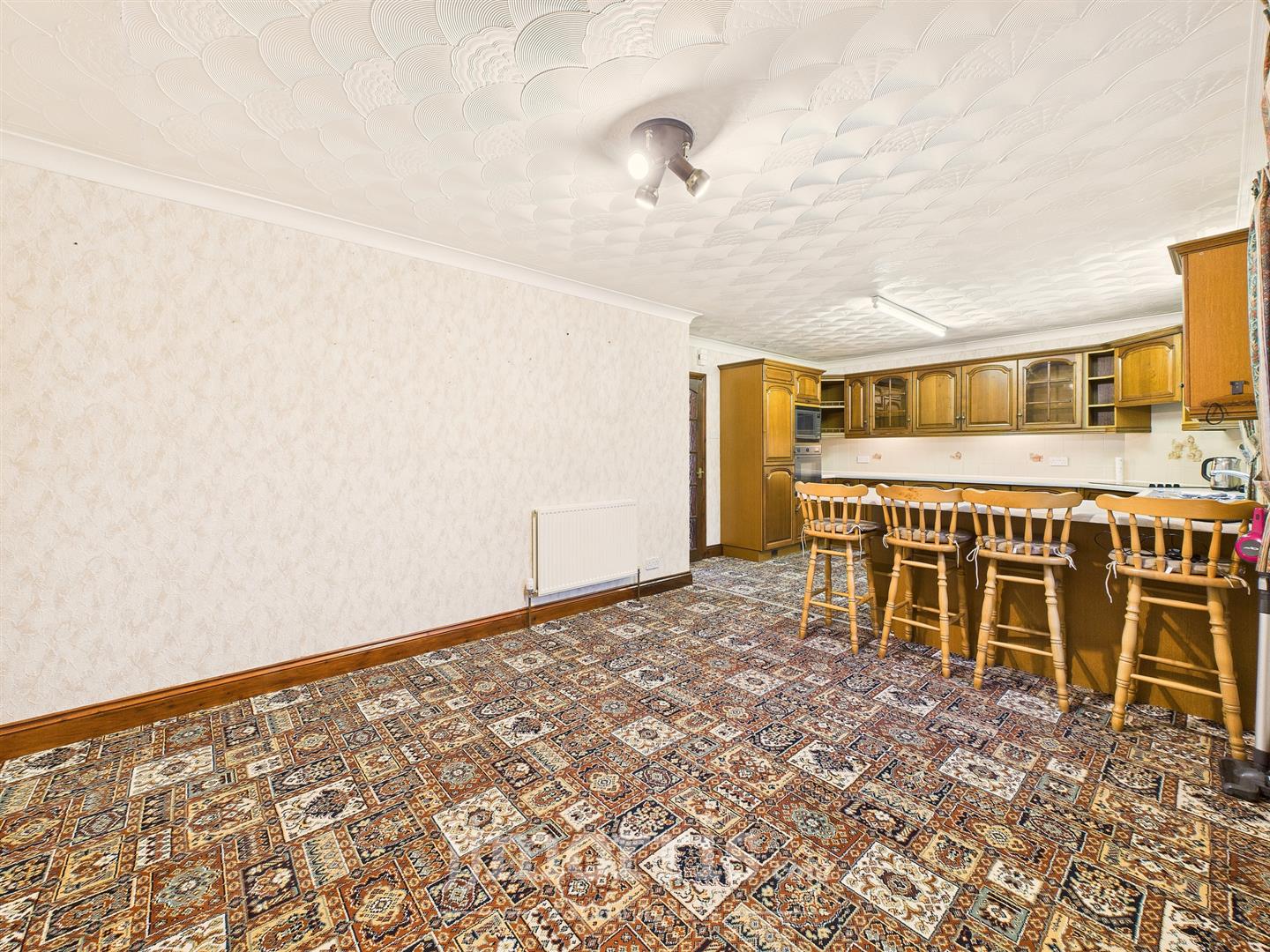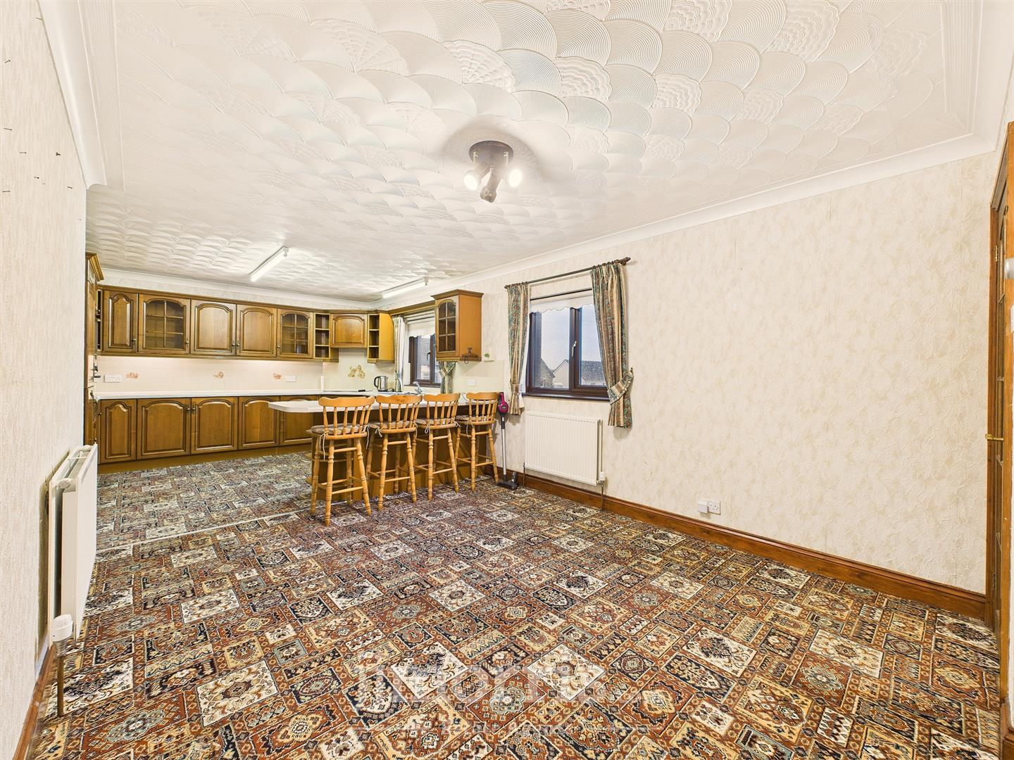 Having a range of wall and base units with complimentary worktop surfaces, breakfast island, stainless steel sink and drainer unit, integrated dishwasher, fridge/freezer, oven/grill, microwave, counter top electric hob with extractor fan over, uPVC double glazed windows, radiators, coved ceiling, part tiled walls, door to:-
