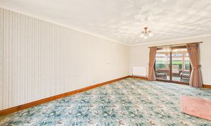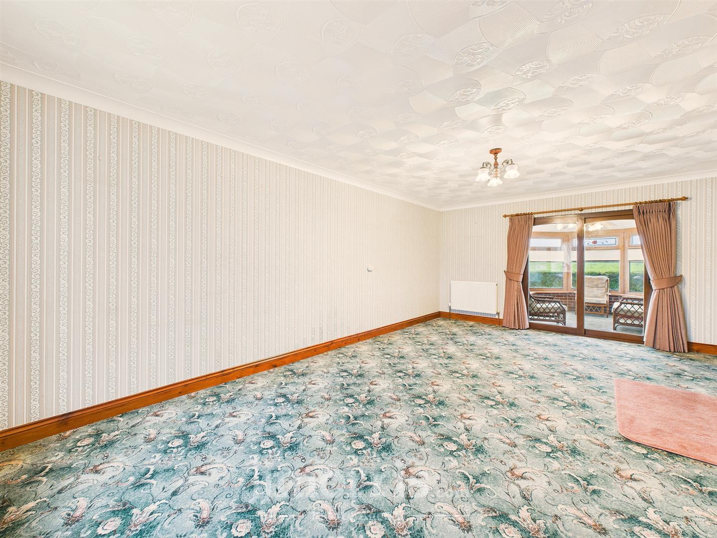 Oil-fired log burner on a slate hearth with feature surround, uPVC double glazed window, coved ceiling, radiators, uPVC double glazed sliding door to:-