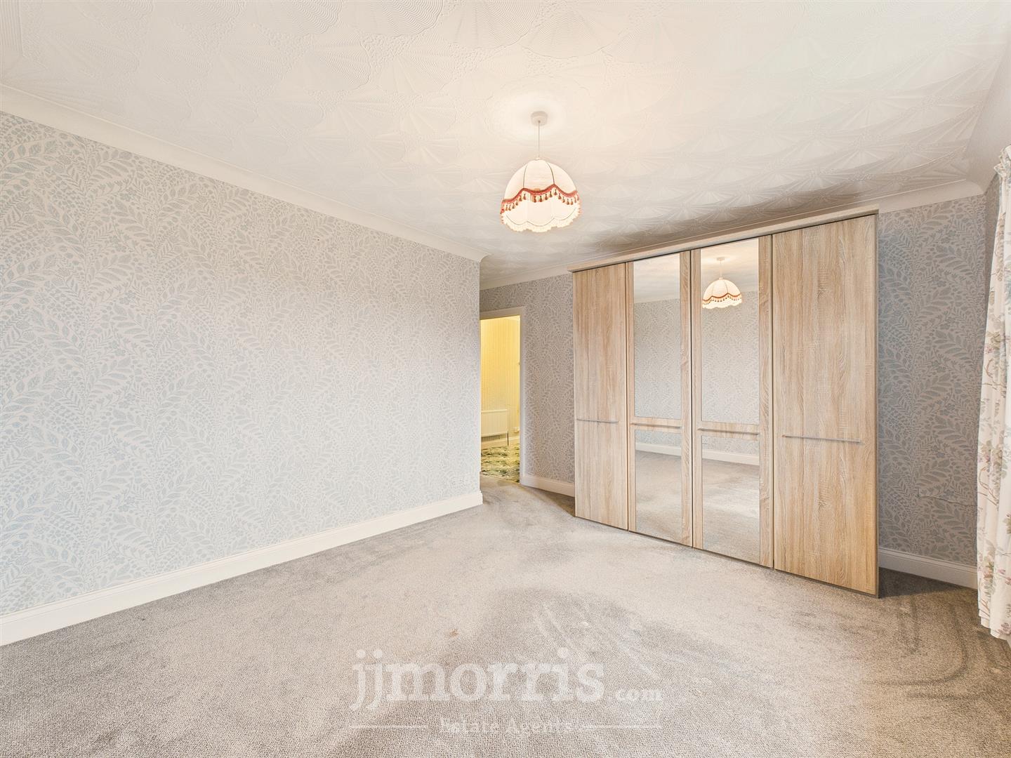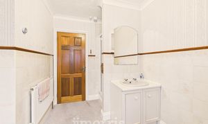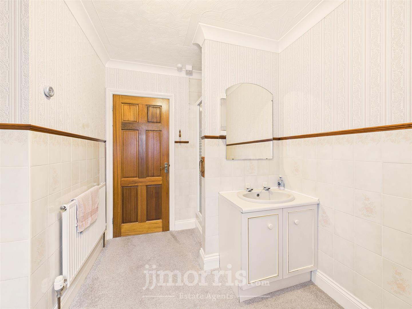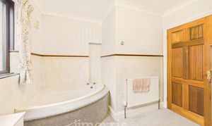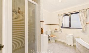 Low flush WC, vanity unit with hand wash basin, corner bath, walk-in shower with electric shower, extractor fan, towel rail, uPVC double glazed window, coved ceiling, part tiled walls, radiator.