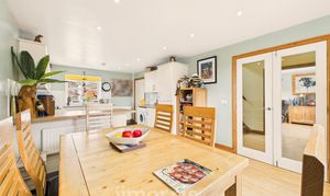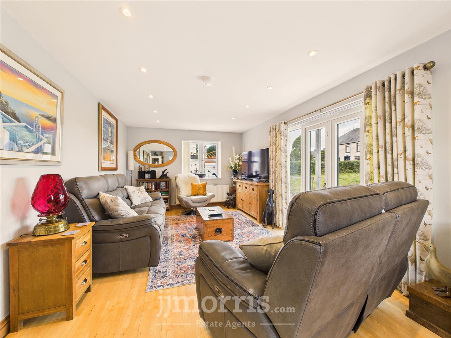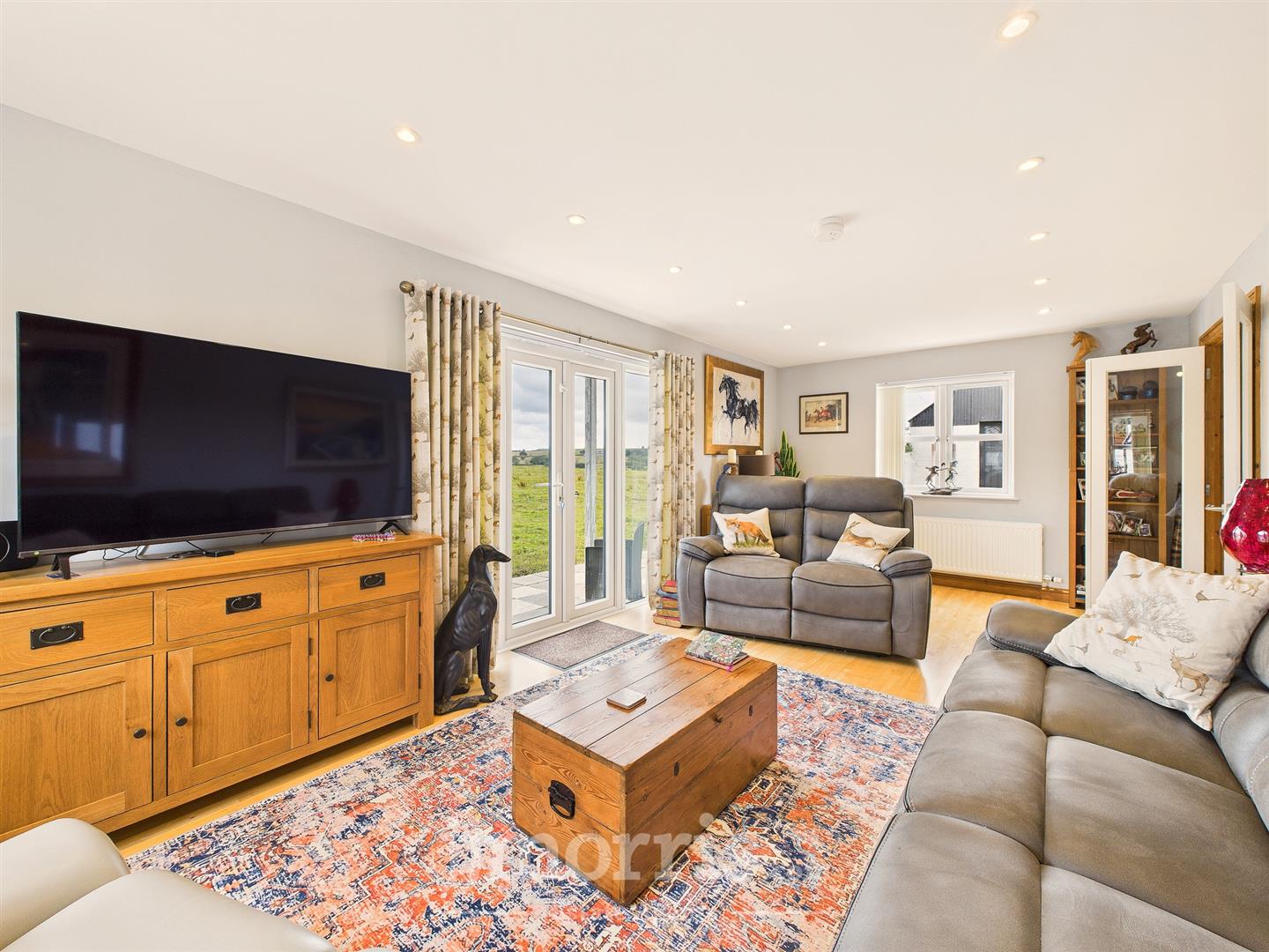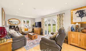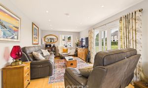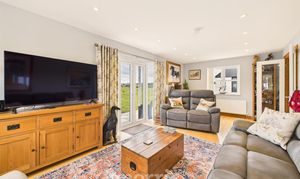 A large through room, benefiting from uPVC patio doors to side, windows to the front and rear, recessed spotlights, wood effect flooring, radiators, glazed doors to hall.
