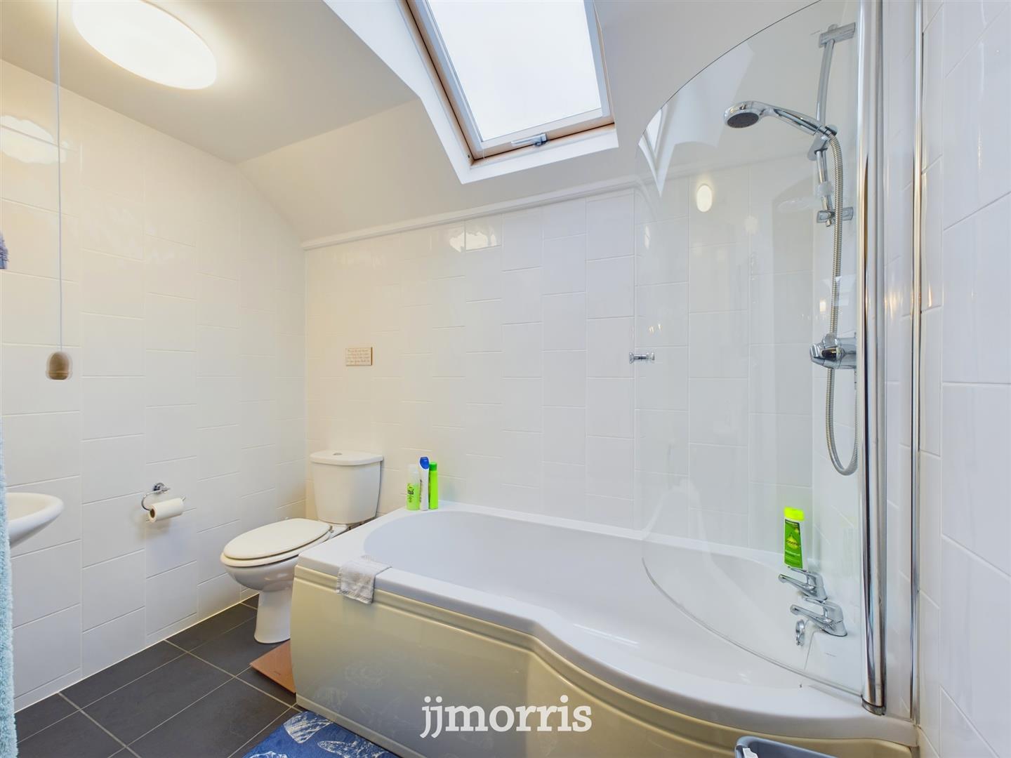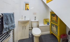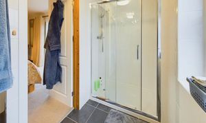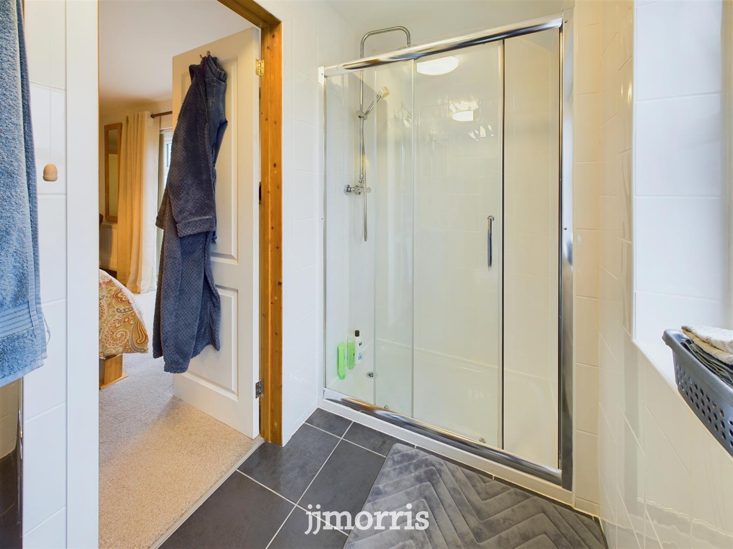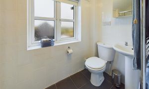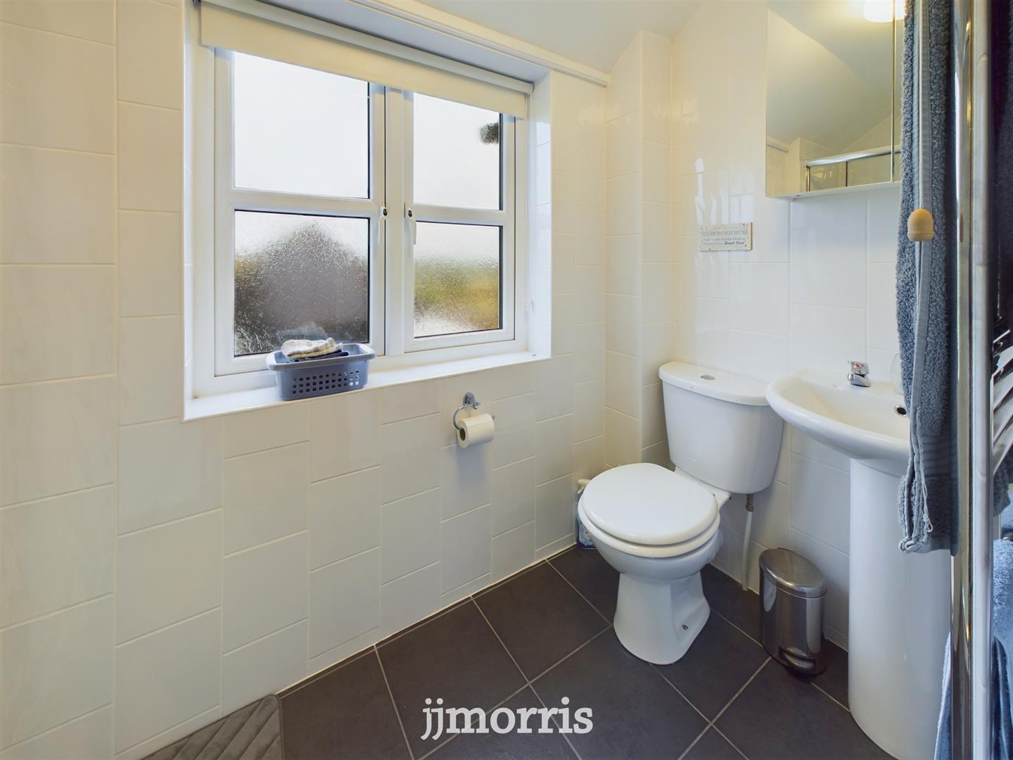 A three piece suite comprising pedestal wash basin, low flush toilet, shower cubicle, heated towel warmer tiled flooring and walls, uPVC double glazed window.