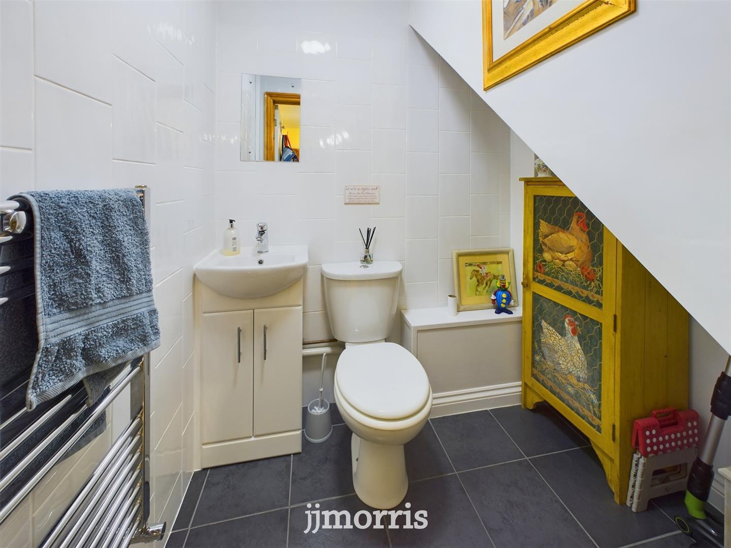 Low flush toilet, wash basin set in a vanity unit, heated towel rail and part tiled walls.