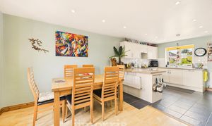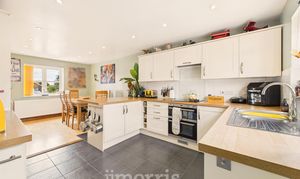 Having a range of floor and wall units and worktop surfaces incorporating single drainer stainless steel sink unit, Lamona built-in appliances to include hob, double oven, cooker hood, fridge freezer and dishwasher, plumbing for washing machine, tiled splash backs, 2 radiators, wooden floor to Dining area, with tiled flooring to the kitchen, glazed doors from hall. Door to: