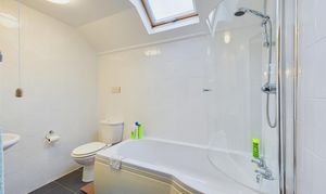 Panel bath and shower over, close coupled toilet and pedestal wash basin, tiled walling and floor, extractor fan, towel warmer.