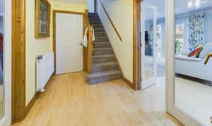 Wooden flooring, stairs rising off to first floor, radiator, Door to:-