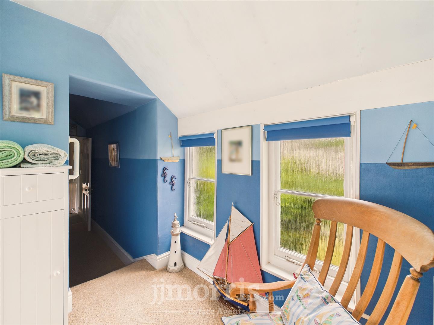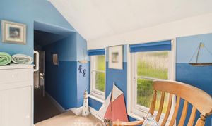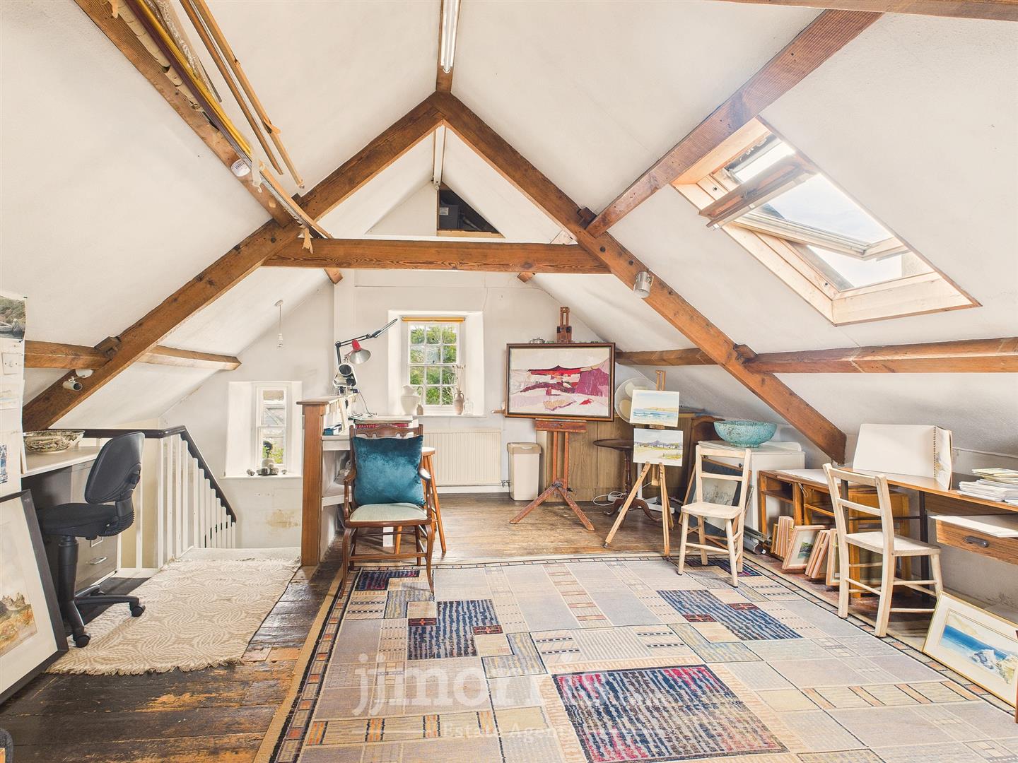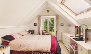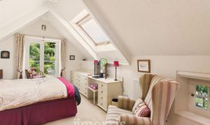 Sash windows to fore and rear, Velux windows to side, exposed beams, sash window over staircase, wooden floor, radiators, spot lights, storage space into roof eaves.