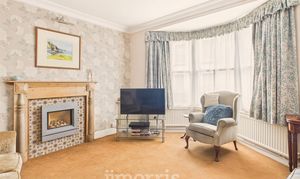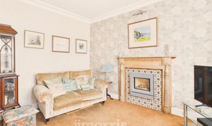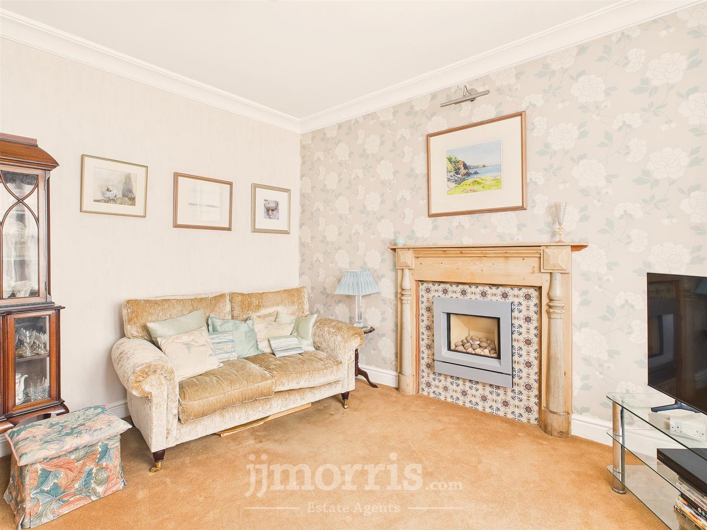 Sash bay window to fore, radiators, wall lights, feature fireplace with gas fire insert, tiled surround and wooden mantle over.
