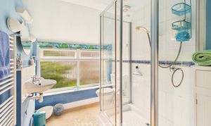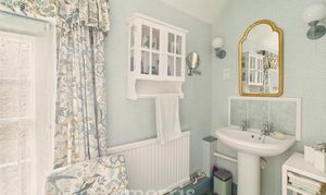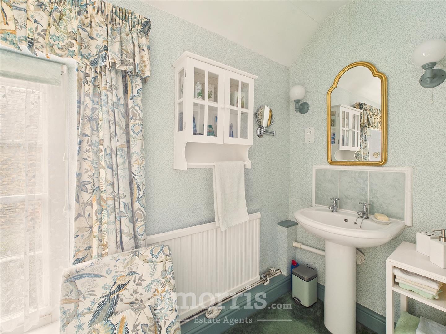 Sash window to side, double glazed window to side, low level w.c, wash hand basin, shower enclosure with electric shower, wall mounted heated towel rail, tile splash back.