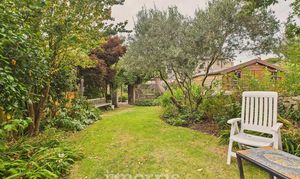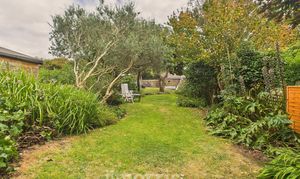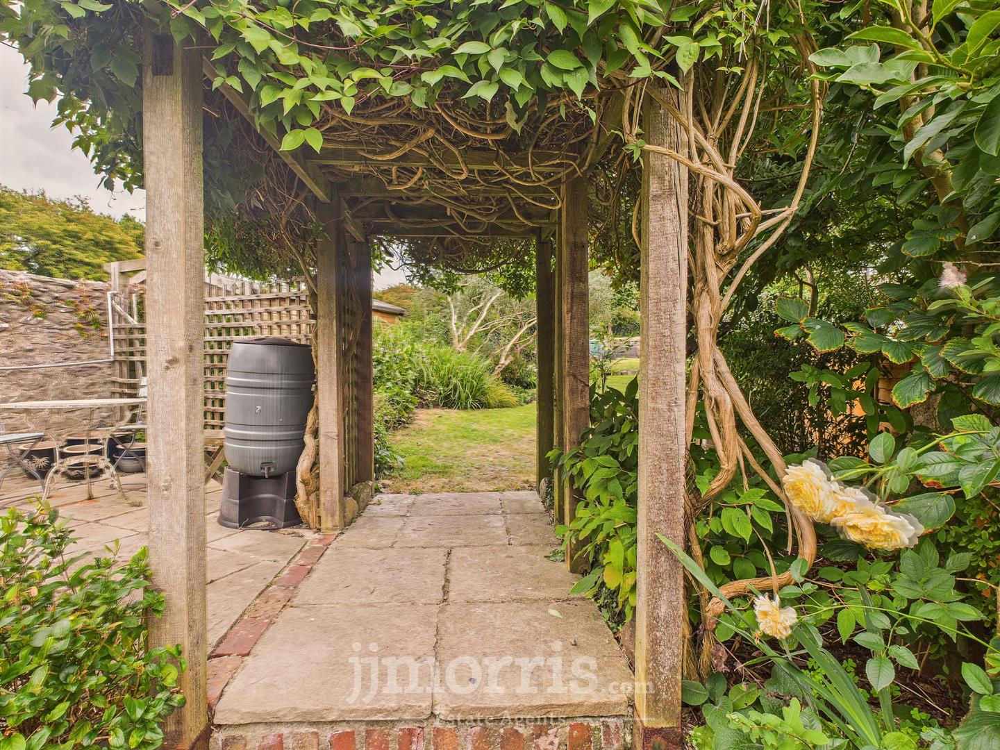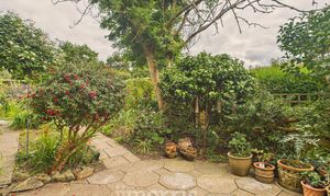 - Spacious rear garden featuring mature trees, flowering plants, shrubs, and climbing greenery.