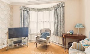 Sash bay window to fore, radiator, feature cast iron open fireplace with wooden mantle over.